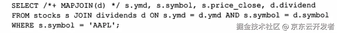 #-- Hive v0.7之前需要通过添加标记 /*+ MAPJOIN(X) */ 触发,如下图