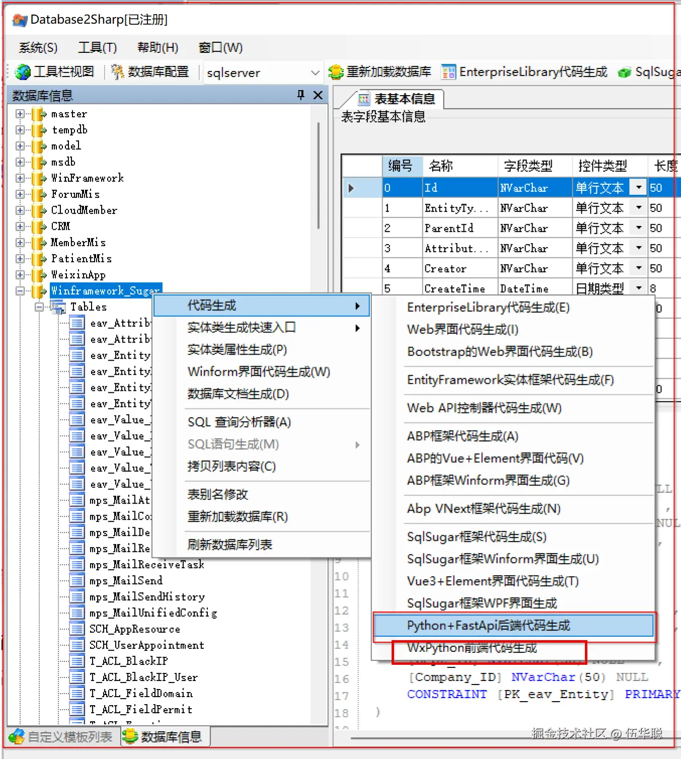 在代码生成工具打开数据库列表后,右键菜单可以选择生成对应的Python+FastApi后端项目,如下界面所示。