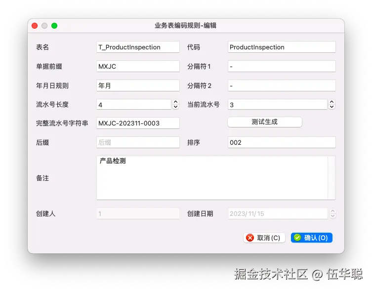 常规的对话框中,业务表编码规则的新增、编辑界面如下所示。