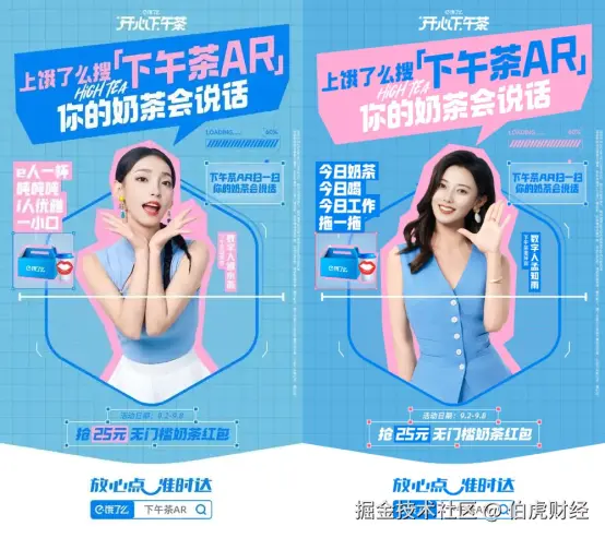 与此同时,AI也成为了互动营销的新玩法。比如茶百道、益禾堂等品牌联合饿了么推出“下午茶推荐官”活动,结合了超写实虚拟偶像与AR技术,增加消费者的互动体验。