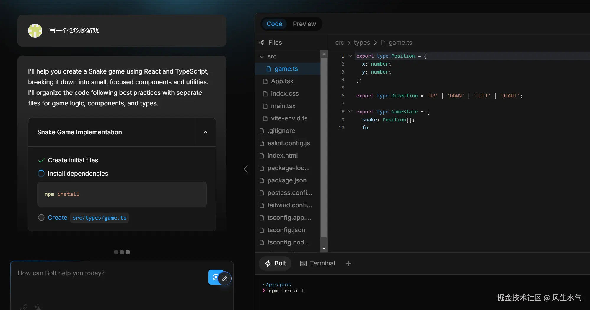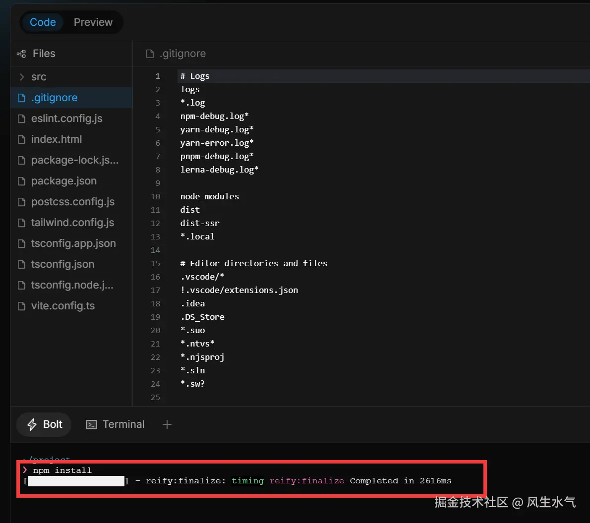 相比于v0.dev,这里的代码编辑展示区域展示的效果更加的炫酷。如果你是专业的软件开发人员,这里的界面你会感觉更加的亲切(更加类似于我们平时使用的IDE)。比如在实际的开发过程中,运行时可能需要配置环境,安装一些包,而这里的安装过程也很清晰的展示出来。