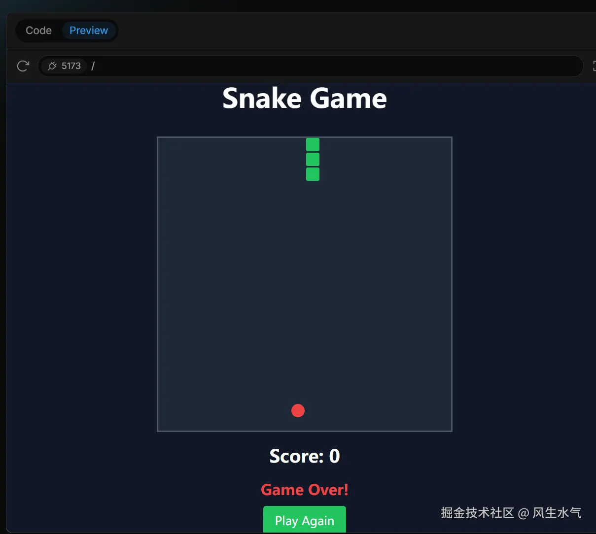 同样,当代码执行生成完成之后,完整的代码会被运行起来,而运行的效果会被展现在preview tab页中。比如上面生成贪吃蛇的代码,运行之后的效果如下。(看起来好像比初版的v0.dev生成的效果要更好)