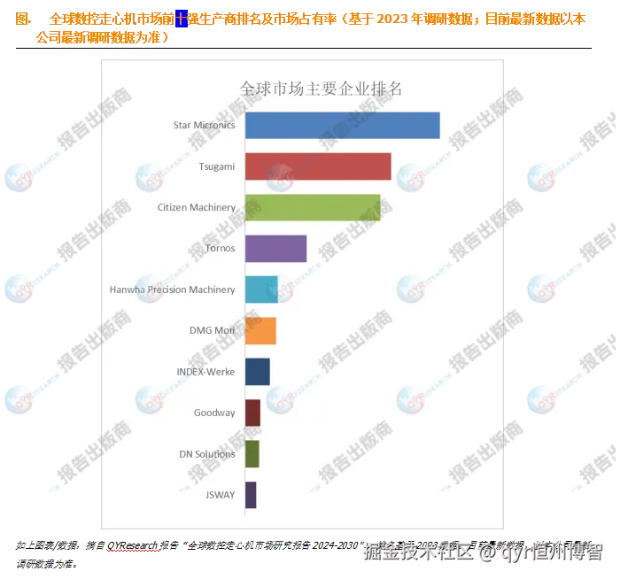 全球范围内,数控走心机主要生产商包括Star Micronics、Tsugami、Citizen Machinery、Tornos、Hanwha Precision Machinery等,其中十大厂商占有大约82%的市场份额。