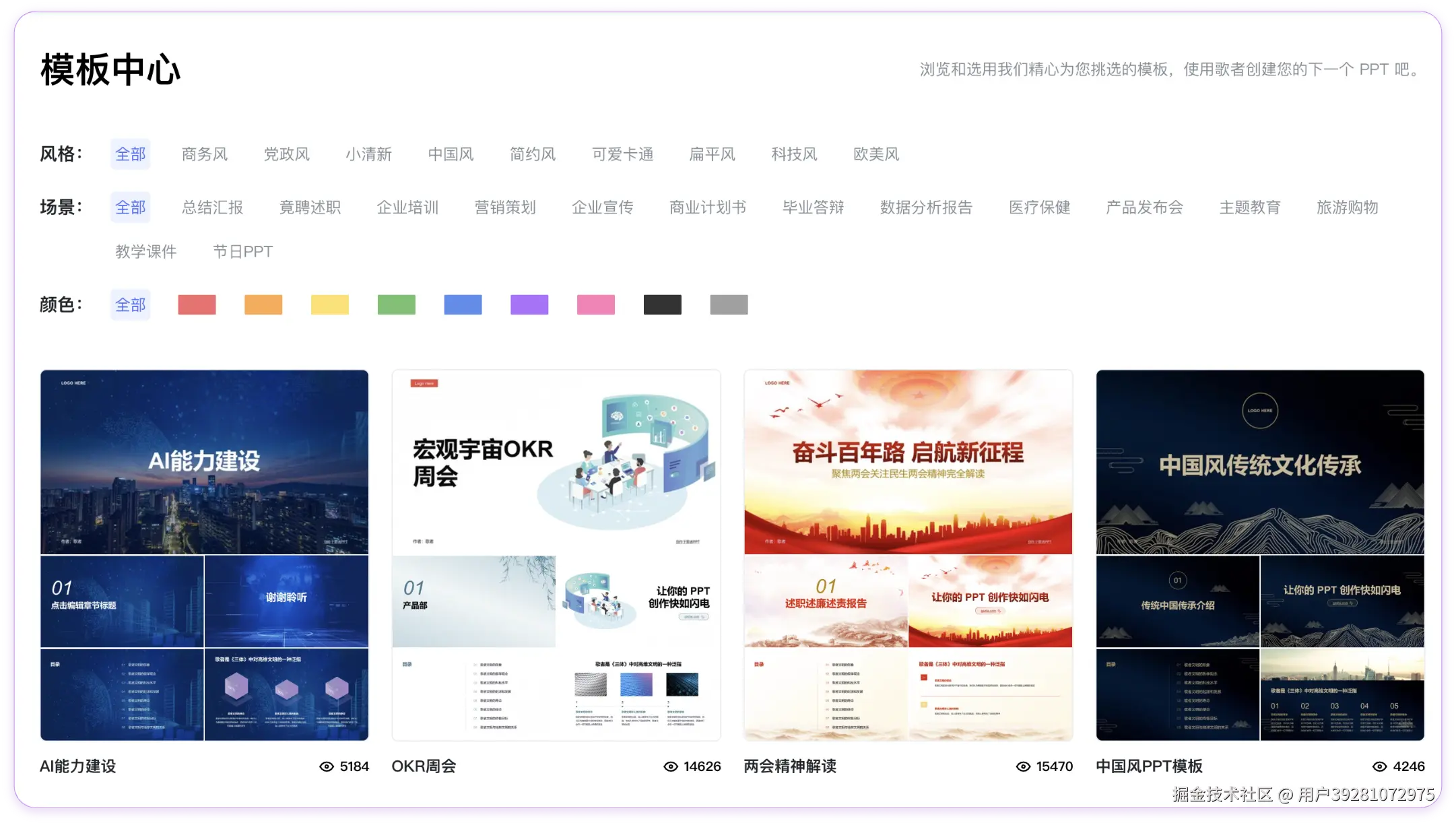 **4. 多样化模板与自定义支持:**歌者 PPT 内置丰富的专业模板和版式库,用户可随场景挑选合适模板;此外,用户可上传专属模板,打造专属风格的 PPT。