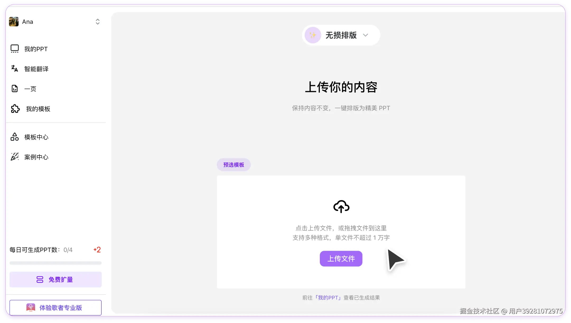 **2. PPT 无损排版:**在用户有完整内容时,可将内容提供给歌者 PPT ,AI 即可进行智能排版。保持原文内容不变,一键为用户生成精美的 PPT,帮用户轻松应对各类场景需求。