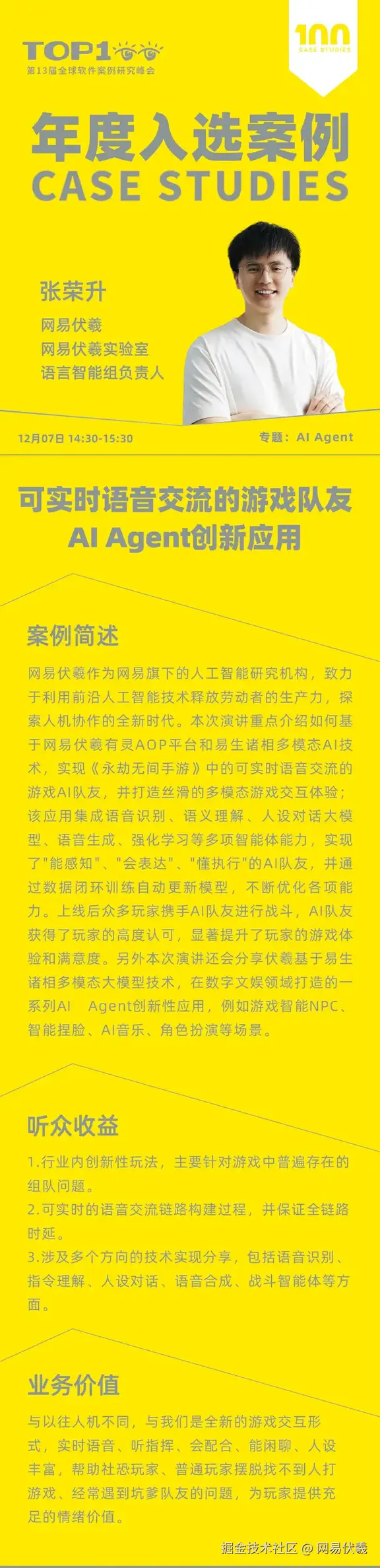 网易伏羲作为网易旗下的人工智能研究机构,致力于利用前沿人工智能技术释放劳动者的生产力,探索人机协作的全新时代。网易伏羲实验室语言智能组负责人张荣升将在全球软件案例研究峰会上(12 月 5-7 日,北京朝阳悠唐皇冠假日酒店)为我们揭示如何利用前沿 AI 技术,打造具有感知、表达、执行能力的 AI 队友,这些技术不仅提升了玩家的游戏体验,还通过数据闭环训练自动更新模型,不断优化 AI 的表现。 这不仅是技术上的突破,更是人机协作新时代的探索。