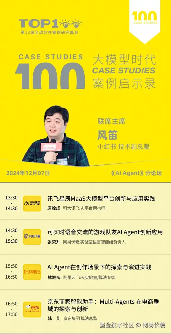 张老师所在的专场是 AI Agent,来自小红书技术副总裁风笛将作为本专场的联席主席,为参会者现场点评每位讲师的分享并做出总结。同时,还有科大讯飞、阿里云和京东的三位老师分享相关话题。