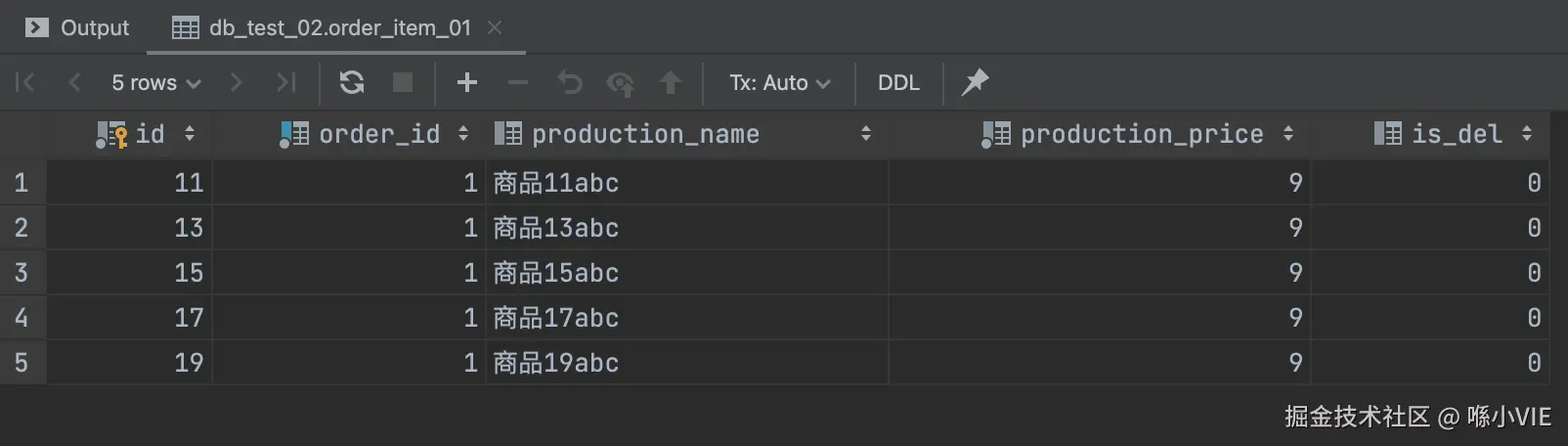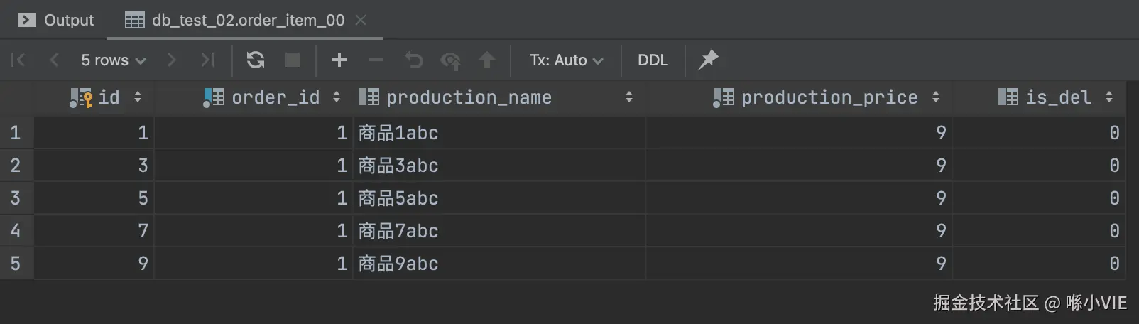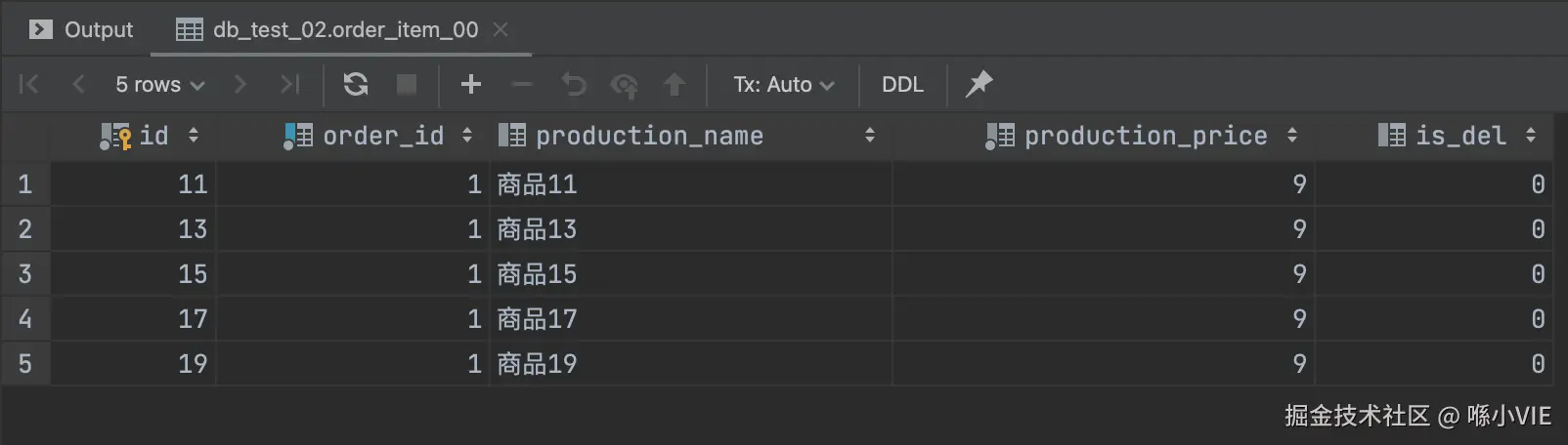 查看 db_test_02.order_item_00 数据,id 为奇数,新增 5 条数据。