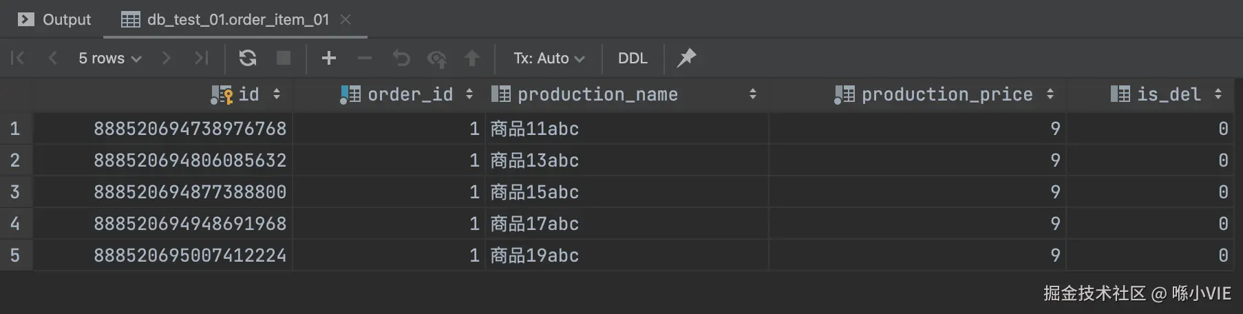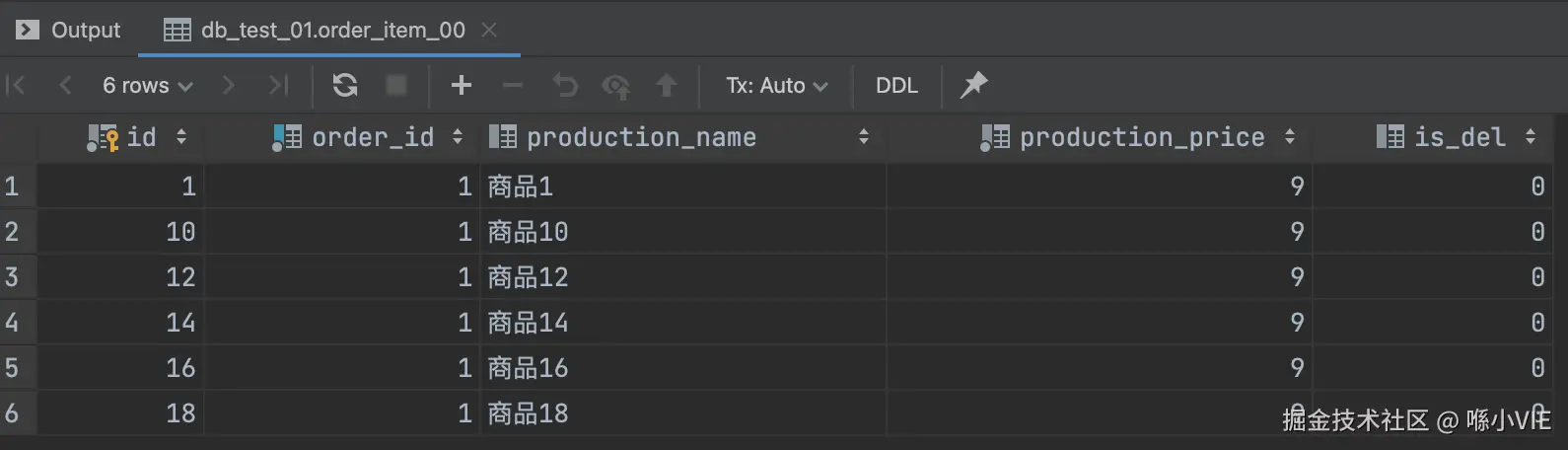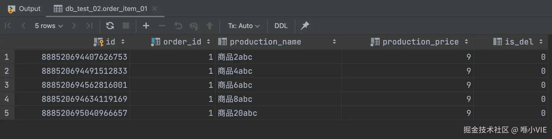 查看 db_test_01.order_item_00 数据,id 不再是简单自增了,不过还是可以从production_name 看出商品的插入顺序。