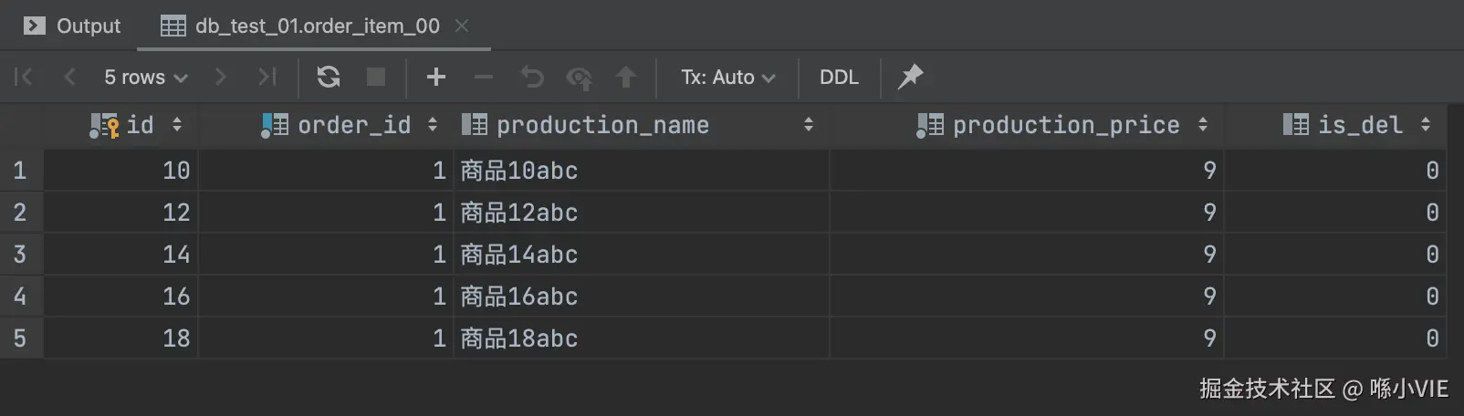 查看 db_test_01.order_item_00 数据,新增了5条数据,id 从 10-18,为偶数。