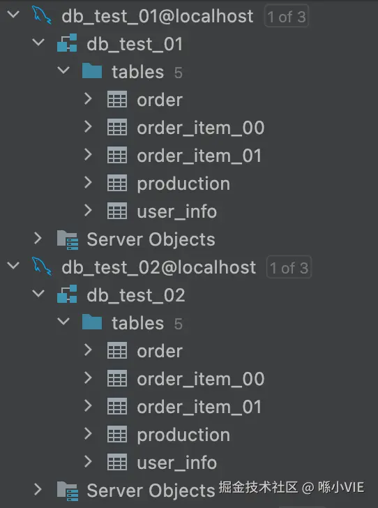 创建两个数据库 db_test_01 和 db_test_02,用于分库分表演示;并且在这两个数据库中都创建相同的表 user_info,production,order,order_item_00,order_item_01。