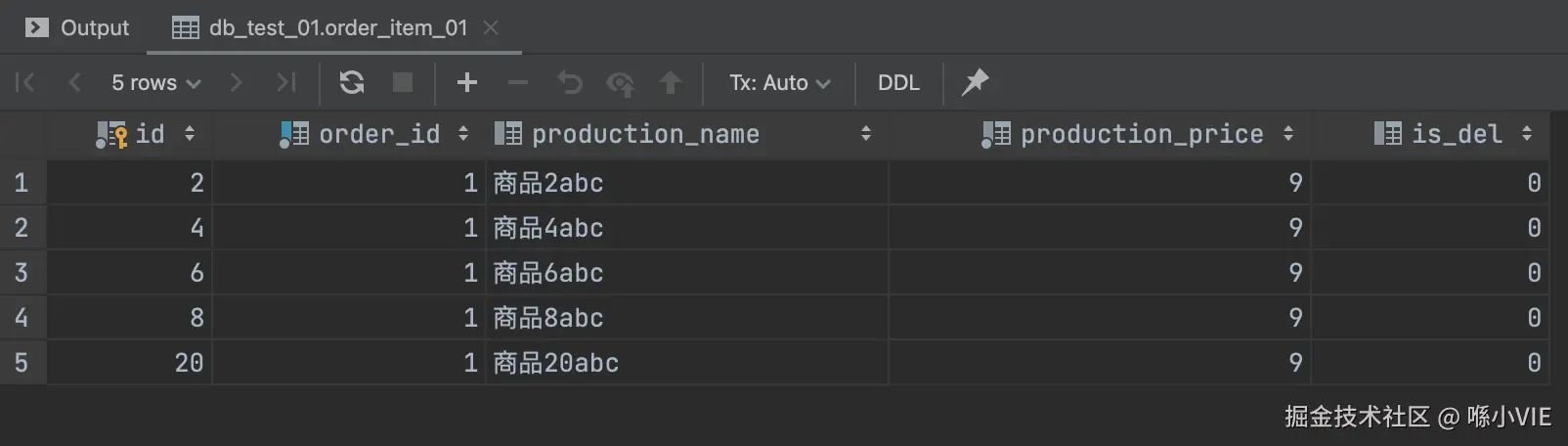 查看 db_test_01.order_item_00 数据,id 为偶数,新增 5 条数据。
