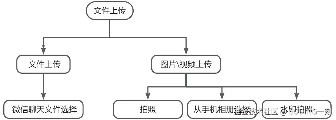 图片上传自动判断上传文件类型为图片/视频上传,提供三种方式供用户选择(拍照/从手机相册选择/水印拍照),选择水印拍照自动调用水印拍照组件拍摄并自动完成上传.