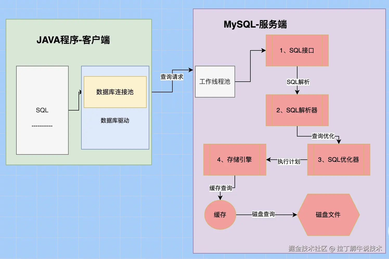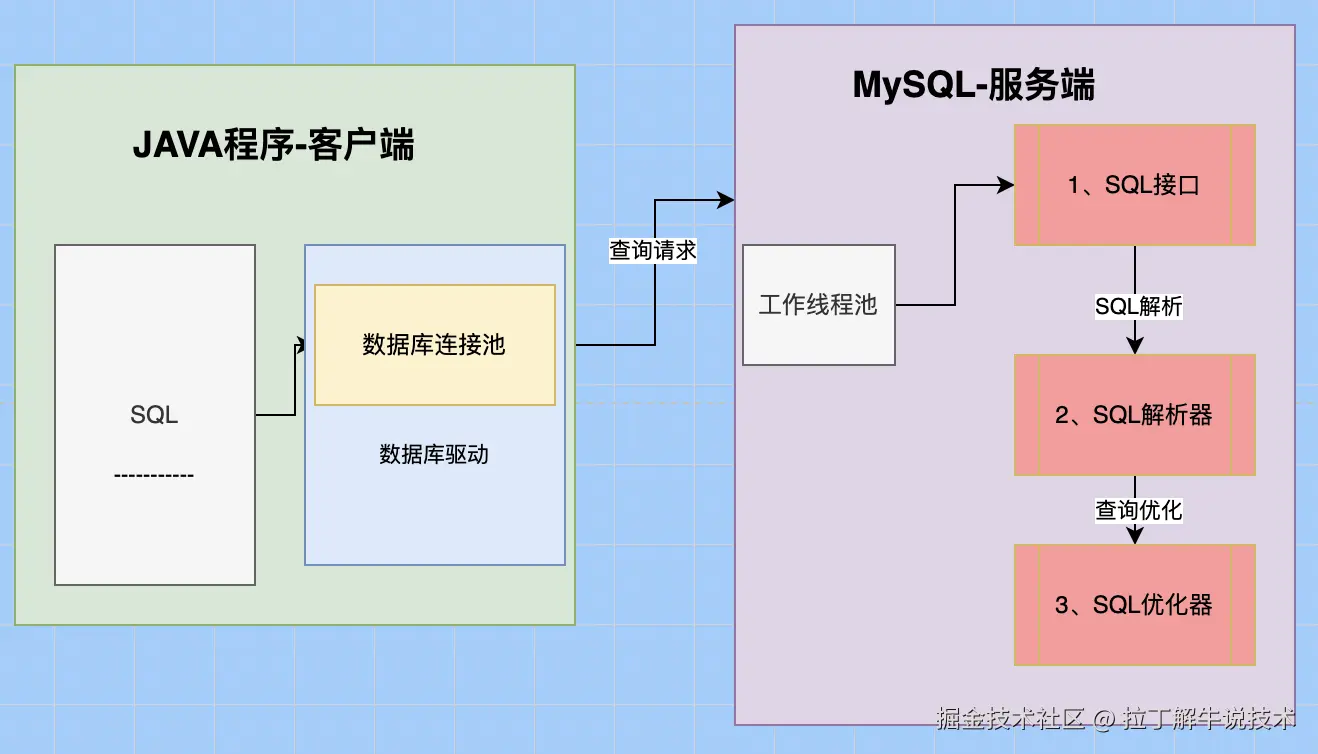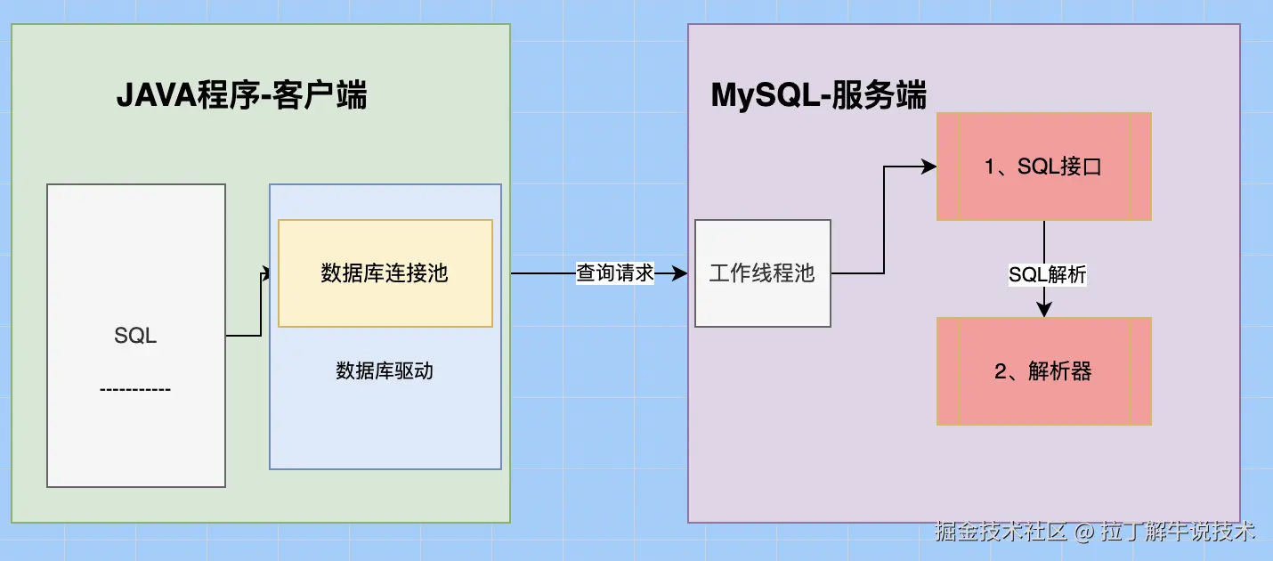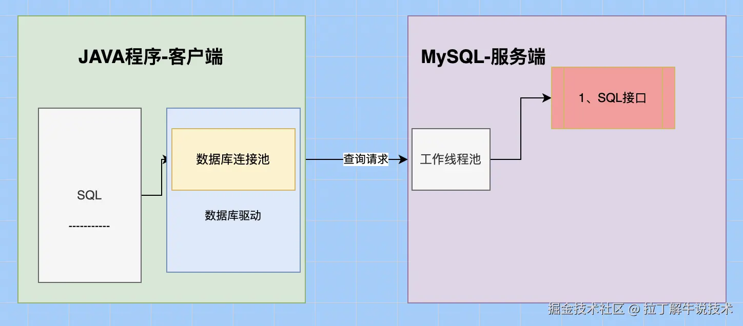 客户端的SQL请求过来后,服务端也是有个线程池在管理客户端的连接,线程池收到客户端的SQL查询请求后,交给【SQL接口】模块进行处理。