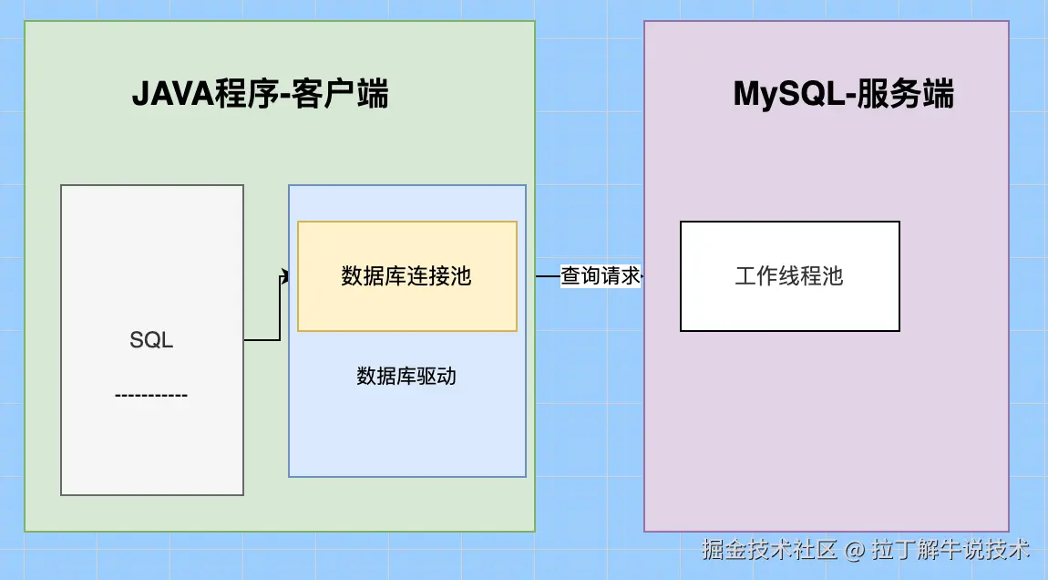 首先我们的客户端程序,需要内置安装对应服务端版本的驱动,以及通过数据库连接池(实际就是TCP/IP的网络连接池)向MySQL服务端发起查询请求。
