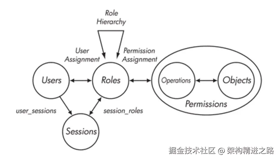 两张经典的模型图,简单又全面,感受一下,没看懂,可以立即自行 google 学习一下:RBAC: