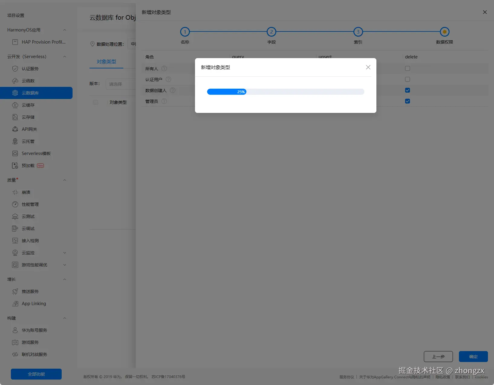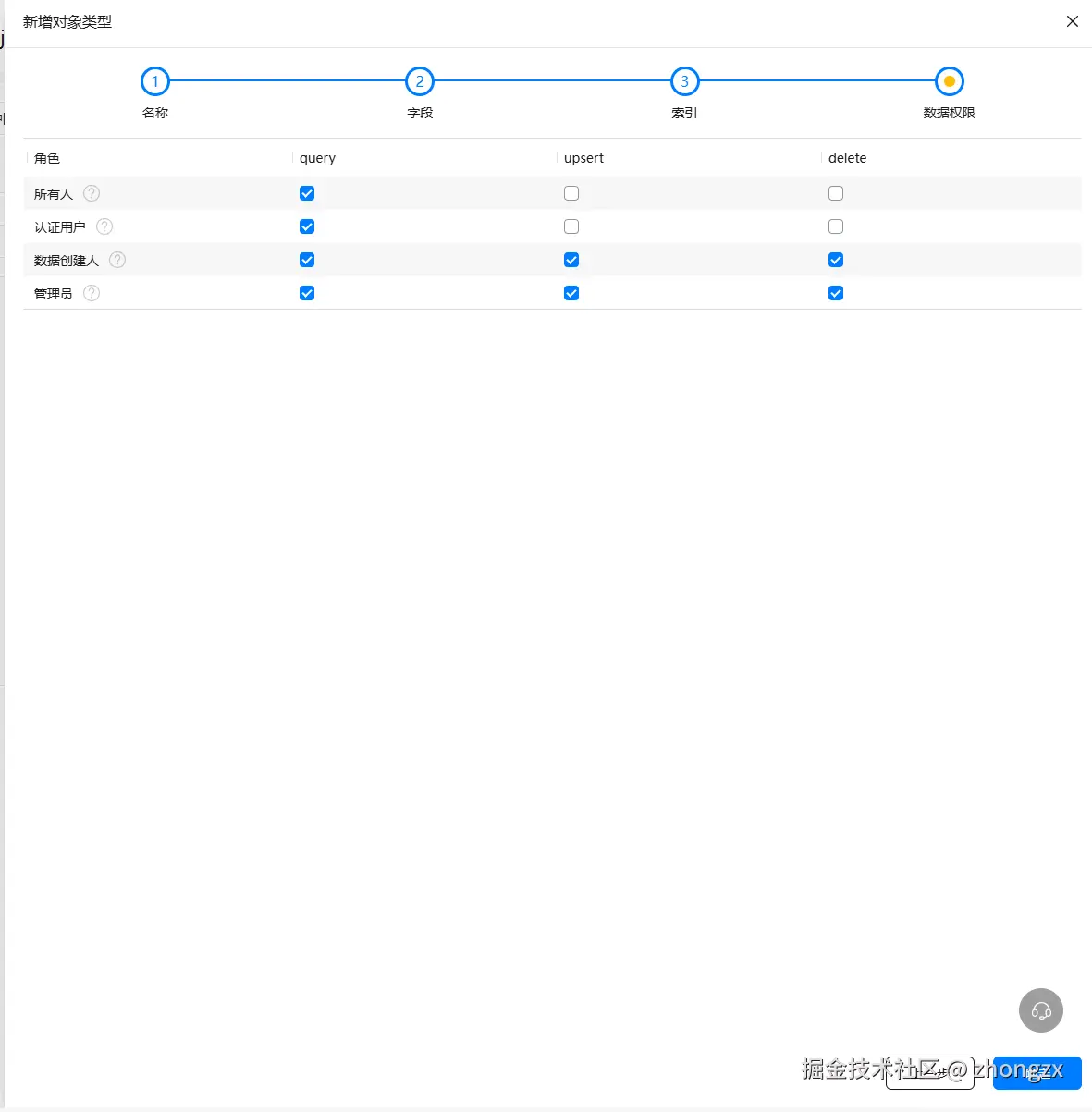 一共有4个步骤,分别是定义名字、字段、索引、数据权限。