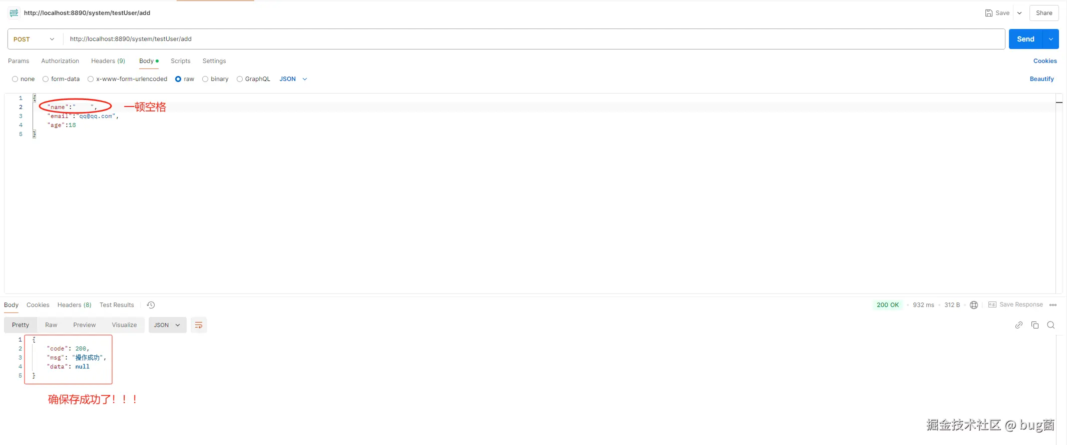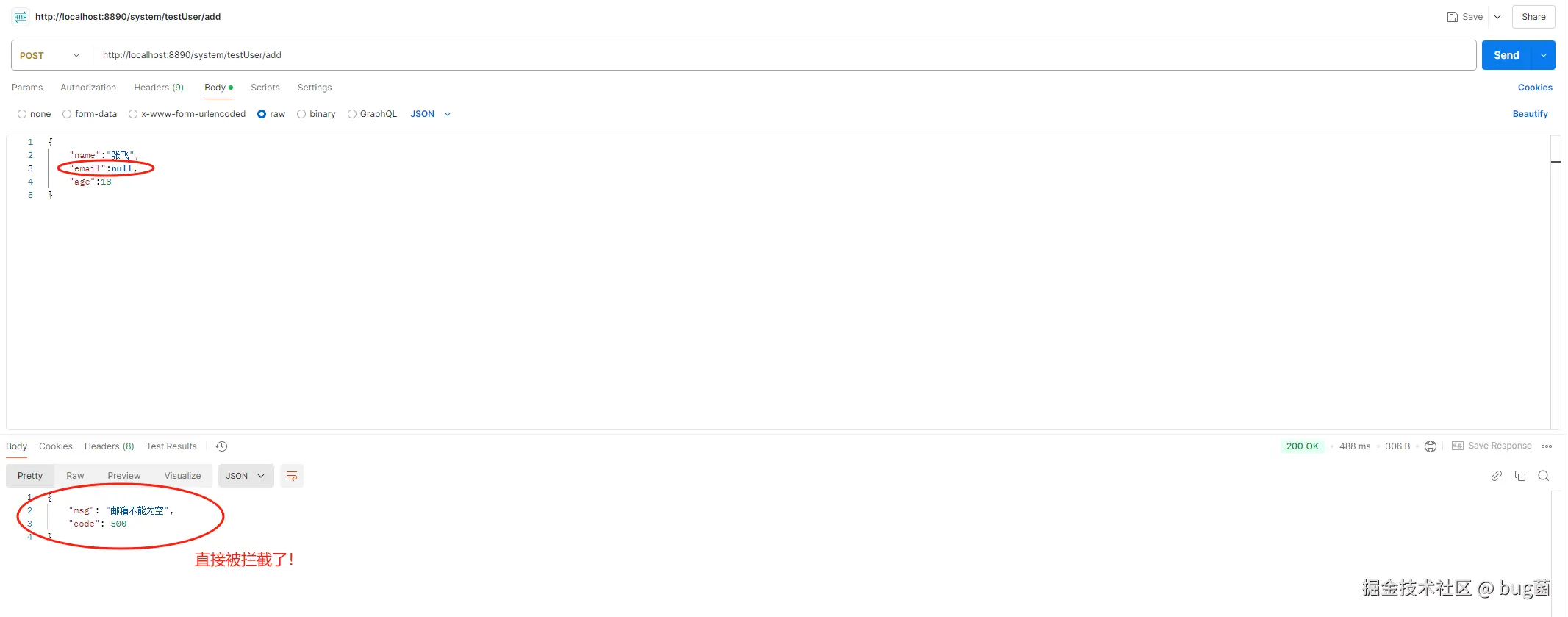继续模拟,这里我们在发请求的时候,将email直接传null值。Postman请求如下:
