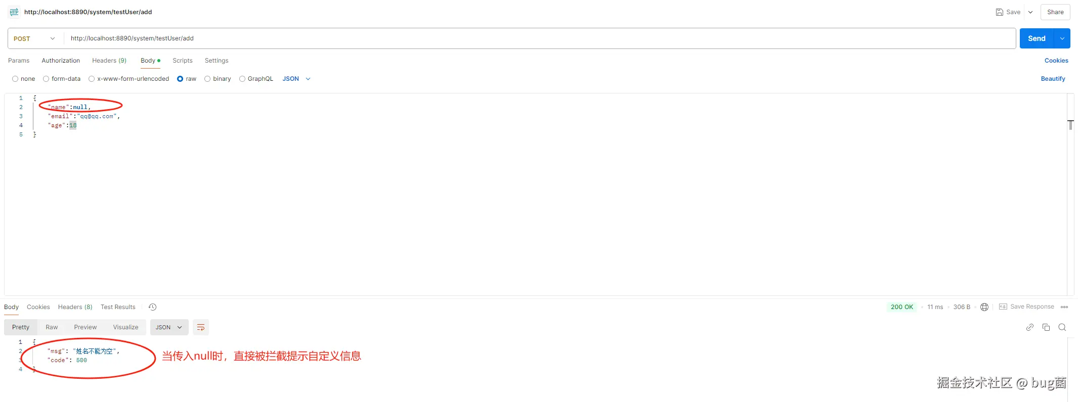 这里我们请求的时候,将name直接传null值进行请求。Postman请求如下: