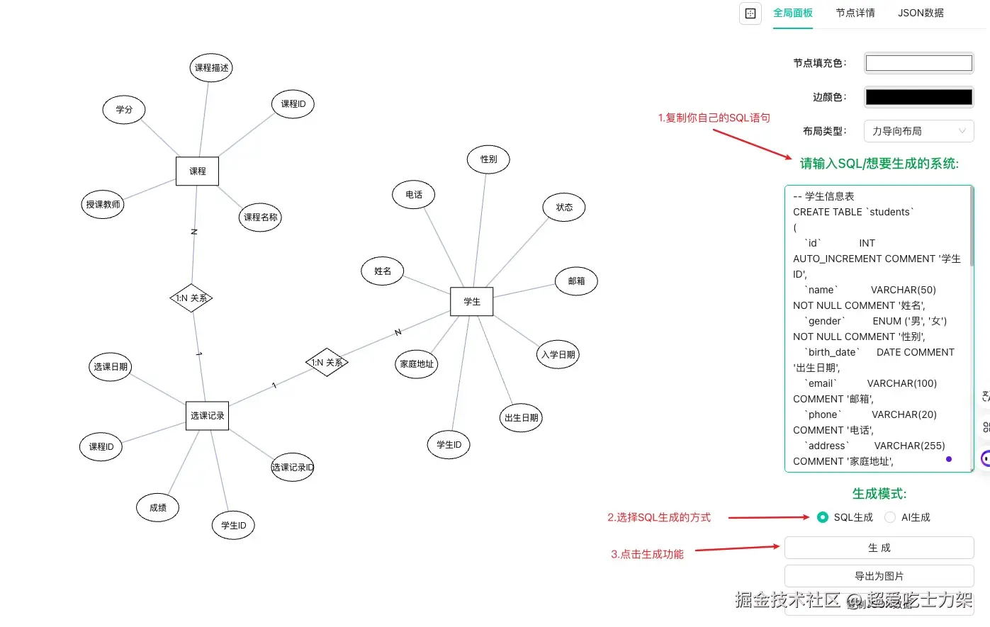 我们深知,学校的数据库课程通常要求根据特定需求设计数据库并绘制ER图,许多同学因此苦恼不已。手动画图不仅耗时费力,还容易出错。正是为了解决这一痛点。它不仅帮助你快速、准确地生成ER图,还让你能够专注于数据库设计的核心内容,而无需花费大量时间在绘图上。