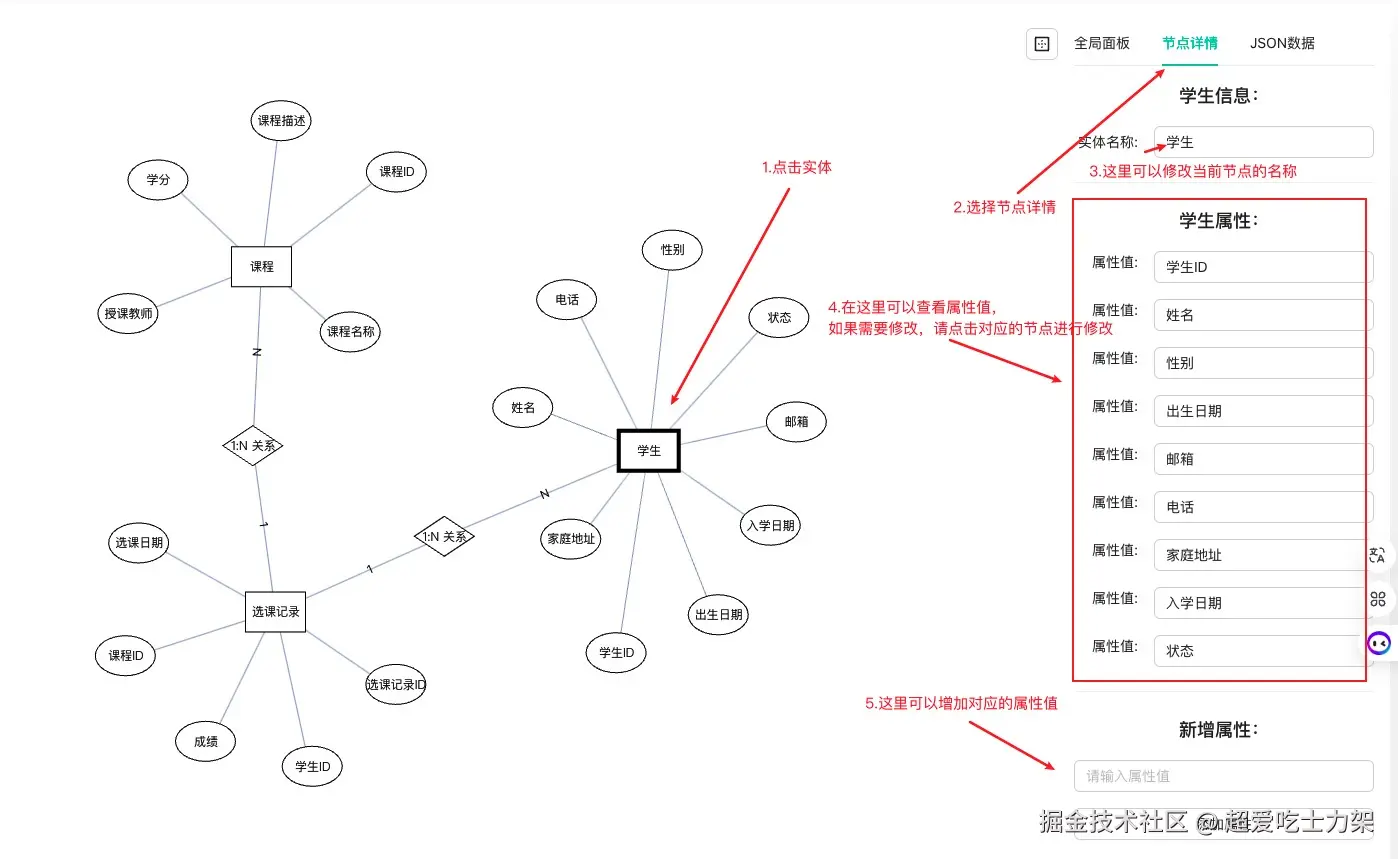 - 可以查看实体对应的属性,如果需要修改对应的节点属性,请点击对应的节点再去修改实体名称