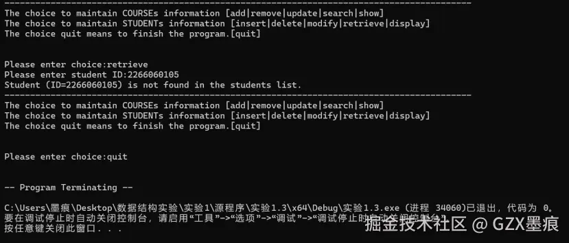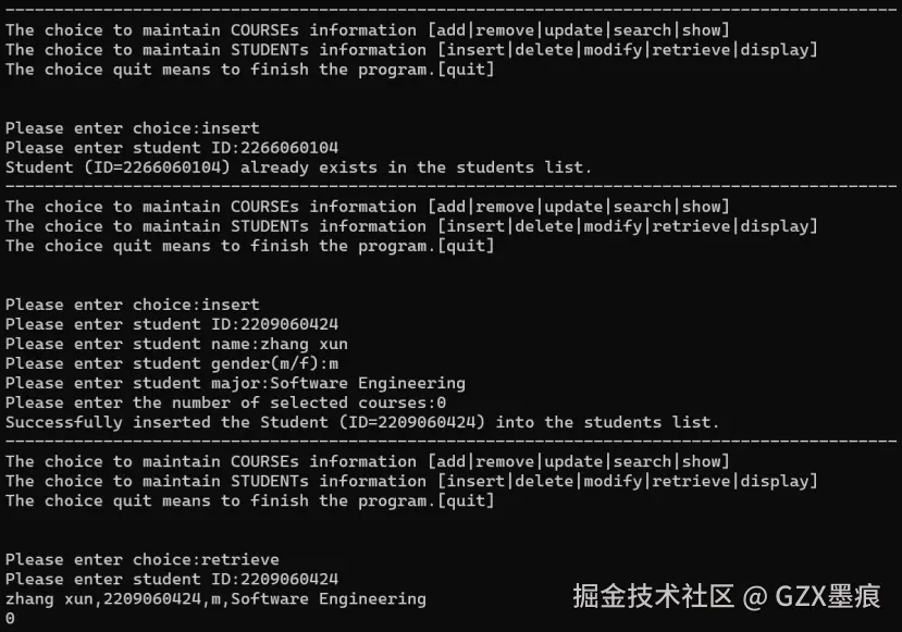 运行实例3主要演示了display、retrieve、insert以及modify功能(其他功能前文已测试,这里不再叙述,但是在测试程序时也用到了)。当输入display指令,程序会打印所有的学生信息。retrieve指令通过学生学号来查找学生信息,如果没找到则会提示相应信息。insert指令用来插入学生信息,如果将要插入的学生学号与已有学号重复也会提示相应信息。
