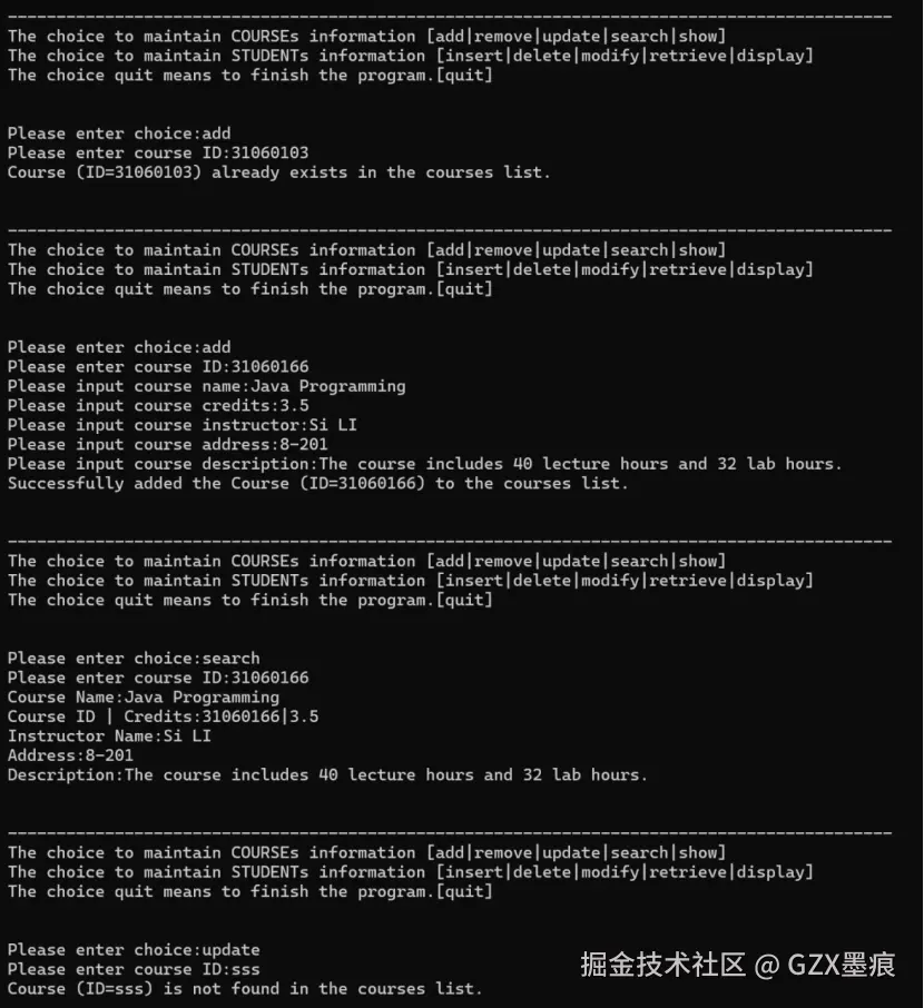 运行实例2主要演示add和update功能(其他功能前文已测试,这里不再叙述,但是在测试程序时也用到了)。当添加已有课程编号时会提示“Course (ID=输入的添加编号) already exists in the courses list.”,反之则会提示继续添加课程的其他信息,待信息输入完毕之后会提示“Successfully added the Course (ID=输入的添加编号) to the courses list.”。当使用update功能时,如果输入不存在的课程编号会提示“Course (ID=输入的课程编号) is not found in the courses list.”,如果编号存在则会先输出此时对应的课程信息,然后提示输入将要修改的信息,输入完毕后会提示“Successfully updated the Course (ID=输入的课程编号) to the courses list.”。