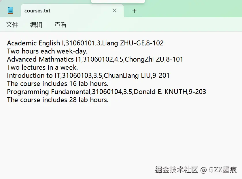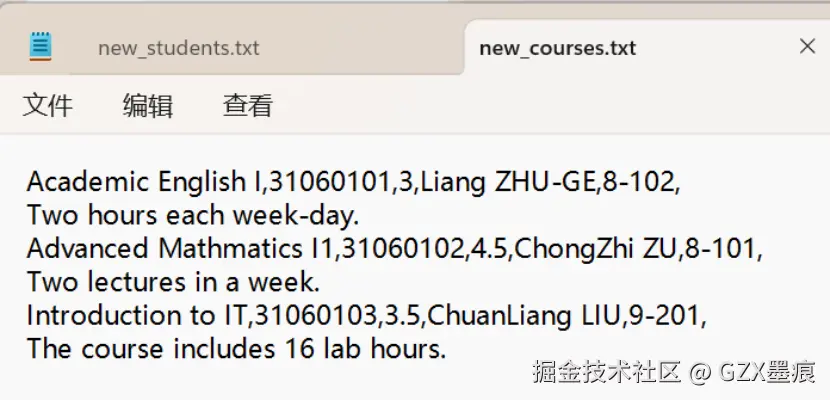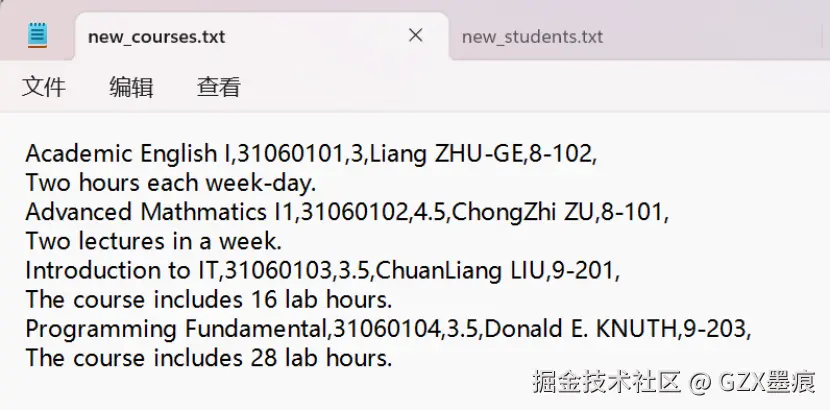 为了管理数据,我们需要从文件中读取信息并能够将修改后的信息保存回文件。下面给出学生表和课程表的示例文件: