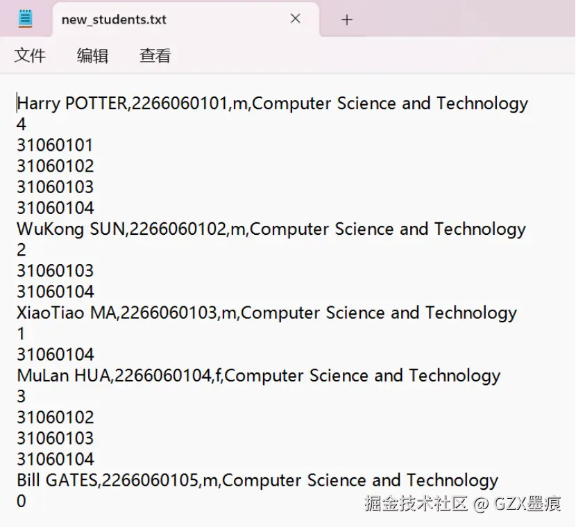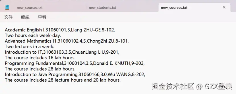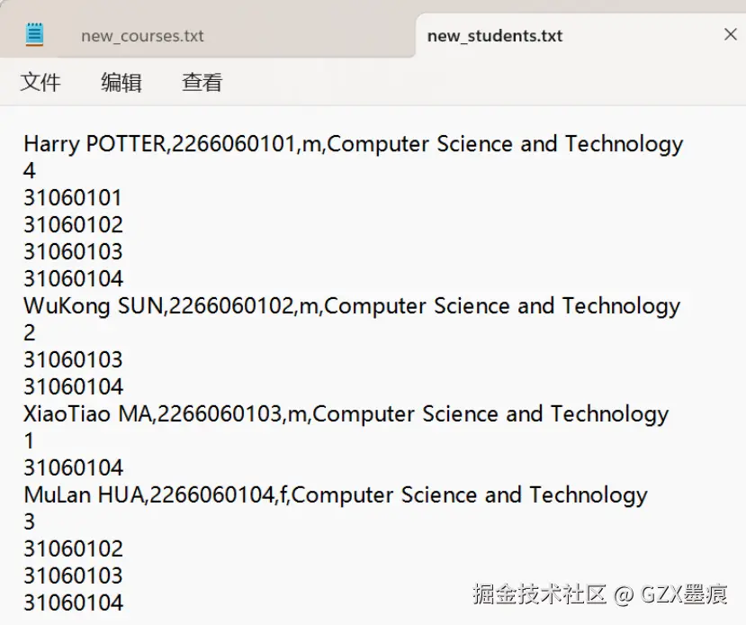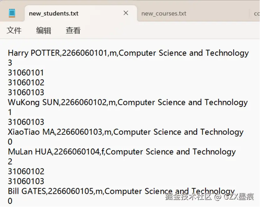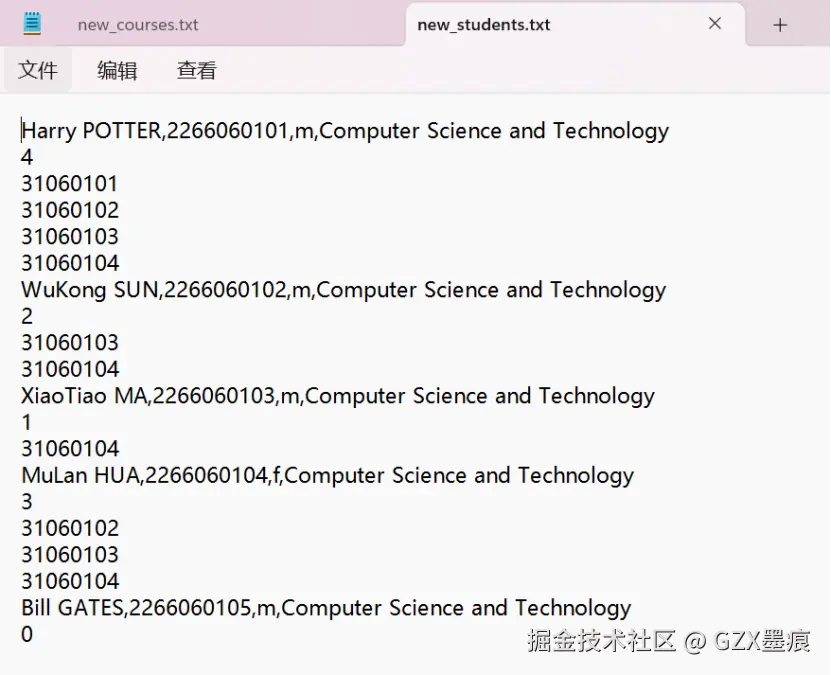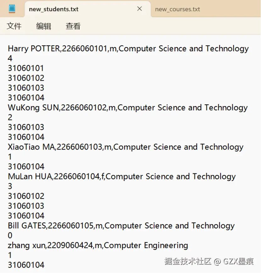 程序运行之后,两个新文件“new_courses.txt”、“new_students.txt”内容分别如下: