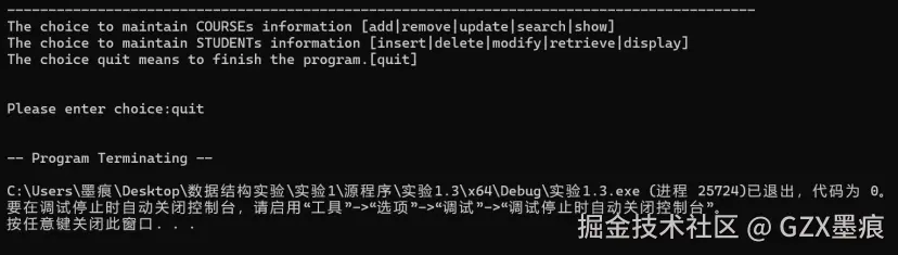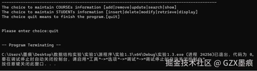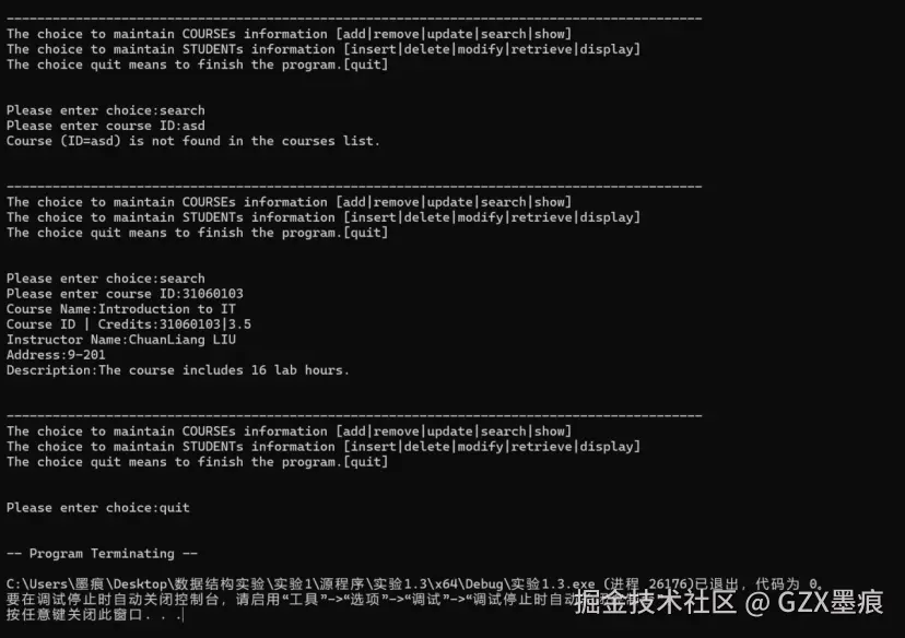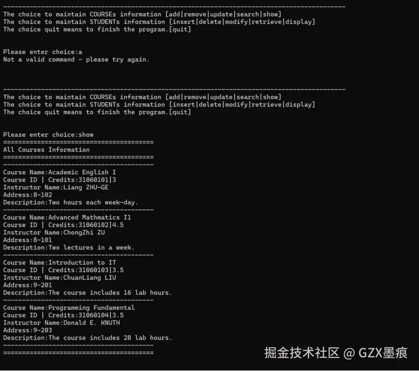 运行实例1演示函数调用功能、show、search以及quit功能,当输入的命令不为提示调用的功能(即功能不存在时),系统会提示“Not a valid command - please try again.”。当使用search搜索ID不存在的课程编号时,系统会提示“Course (ID=输入的查询编号) is not found in the courses list.”。输入已存在的命令(即系统提示输入的命令),会自动调用相关函数,如使用show命令将会展示所有的课程信息,使用search命令在输入正确编号后会输出对应的课程信息。当输入quit时程序运行结束,信息被写入两个新文件“new_courses.txt”、“new_students.txt”。