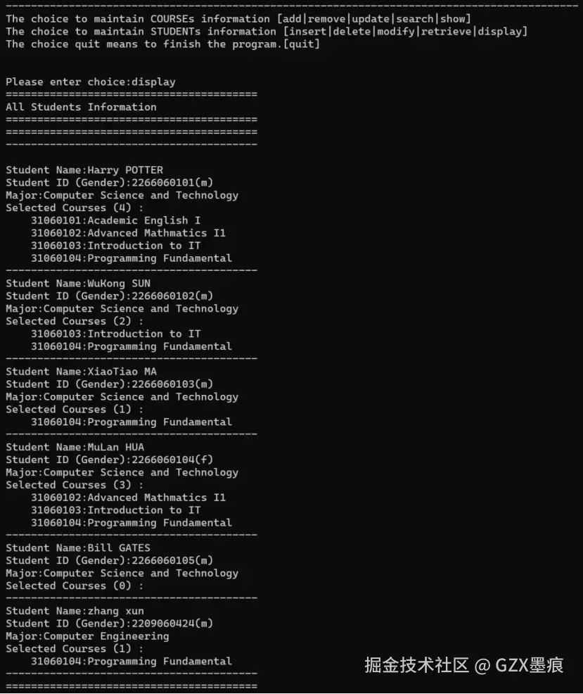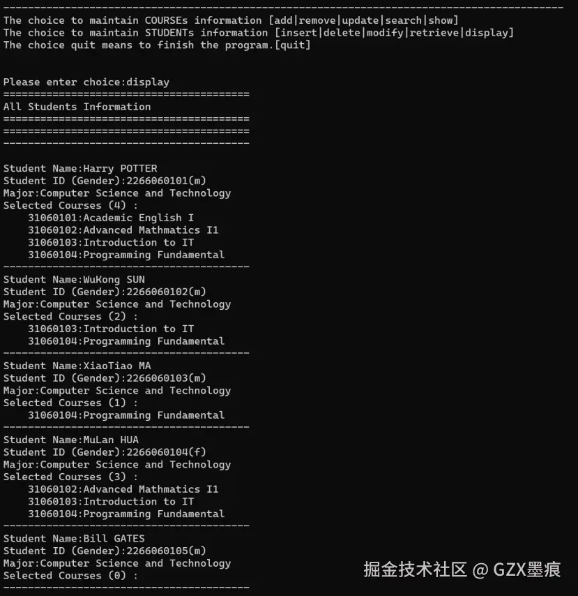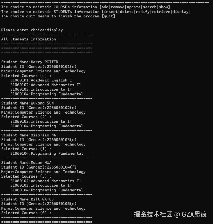 else if (command == "display") Display(students_list, courses_list); // 显示所有学生信息