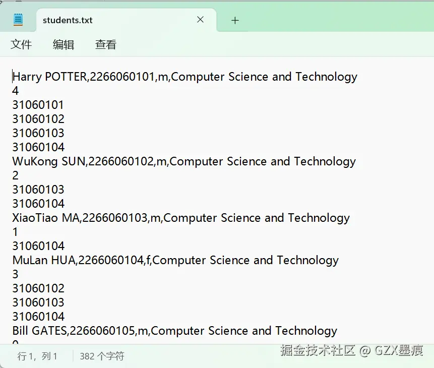 在students.txt中,可以发现如果一行的有效长度超过10,那么这一行的信息必然是姓名、学号、性别、专业,其中这一行的不同内容之间用逗号分隔;如果一行有效长度小于8,那么这一行的信息必然是选课数量;如果一行的有效长度等于8,那么这一行的信息必然是选课编号。