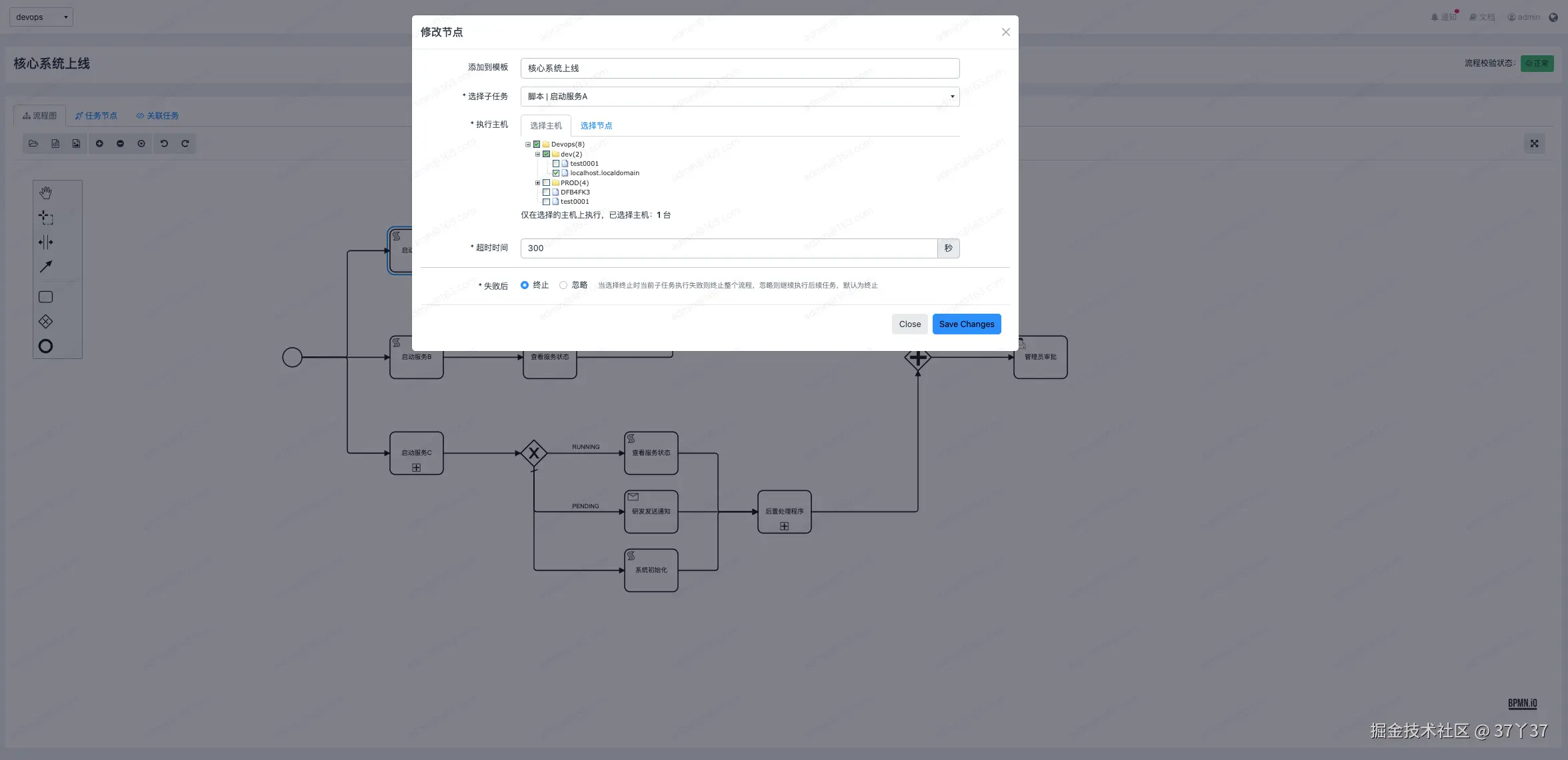 重构后的任务流基本遵循了BPMN规范,采用拖拖拽拽的方式来编排任务流,从而生成可视化的任务流程图,后端也完全根据流程图的节点、网关和连线依次执行,执行状态和结果实时展示在流程图上,不同的执行结果和状态采用不同的颜色渲染,流程图上的节点也可以点击,根据不同的节点类型展示不同的操作按钮和数据,整个过程清晰直观,交互性更强,用户体验大大提升