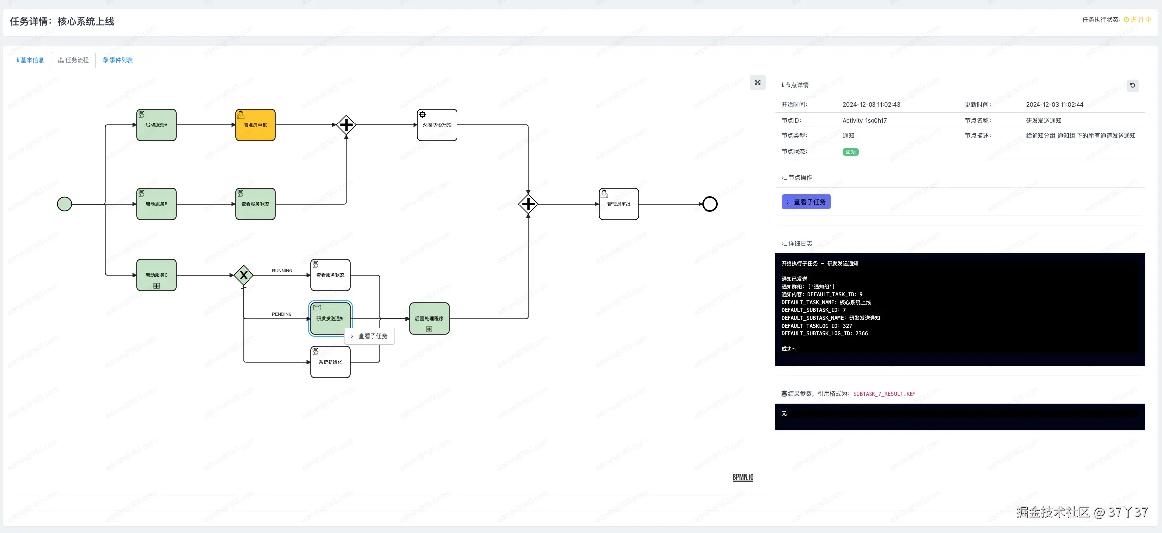 通过这样的设计,我们实现了任务流程从编排到执行的清晰可视化,提升了任务执行过程的透明度,使得流程执行过程更加直观,操作更加便捷易用