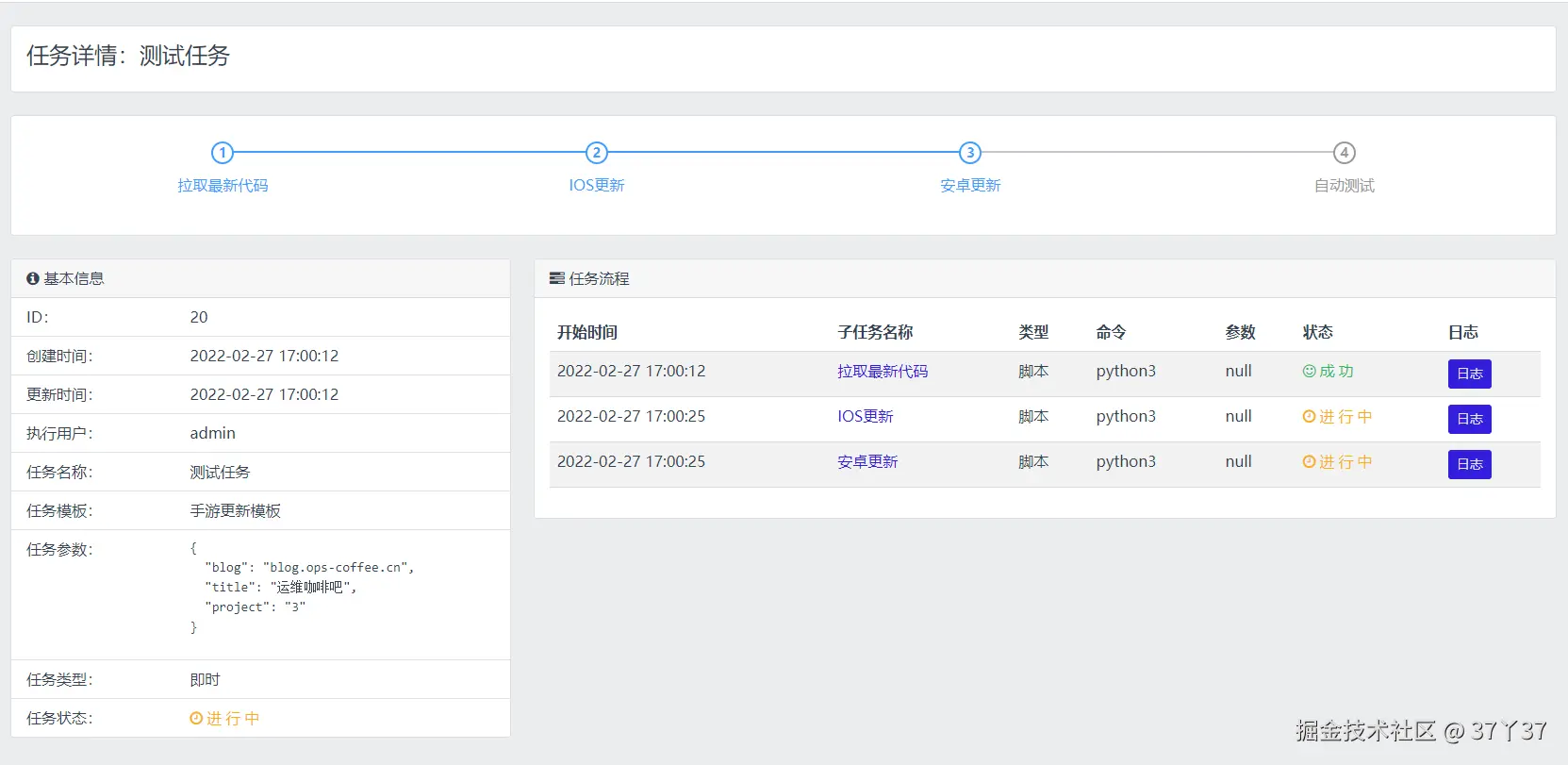 在运维自动化平台中,任务系统无疑是最核心的组成部分之一。它承担着所有打包编译、项目上线、日常维护等运维任务的执行。通过任务系统,我们能够灵活地构建满足不同需求的自定义任务流。早期的任务流后端采用了类似列表的存储结构,根据任务流内子任务的排序依次执行,尽管通过配置相同的顺序可以实现子任务的并行执行,但由于前端使用了简单的steps.js插件,无法直观地展示并行执行的过程。就像下图这样,尽管iOS更新和安卓更新配置了相同的执行排序,可以并行执行,但在图示上并没有直观的显示方式,容易让人产生误解