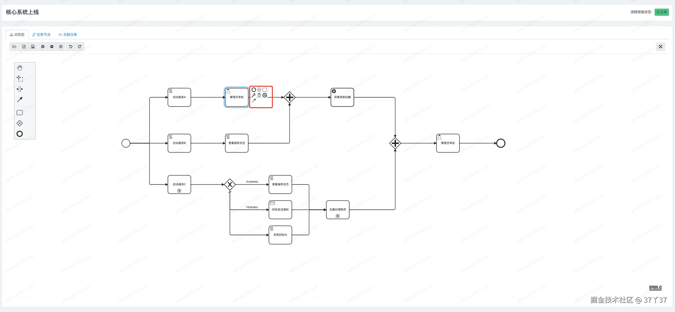 不同类型的任务渲染不同样式的ICON,例如脚本类型就会是一个脚本的ICON、而审批类型则渲染一个用户的ICON,同时也自定义了一些非BPMN标准样式的ICON,例如API类型的任务,则渲染了一个自定义的标识API的ICON,以满足我们多样的子任务类型需求。不同的元素类型也会有不同的操作按钮,例如普通连线只有删除按钮、而排他网关下的连线则会有编辑、默认网关和删除按钮、而对于任务元素的按钮则更加丰富