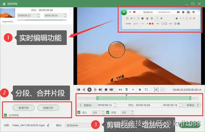 3、后期编辑: 内置简易编辑器,支持视频剪辑、添加特效、调整速度等。