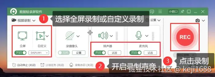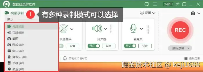 步骤1:启动软件后选择录制模式,设置录制区域、音频来源等参数。点击 【REC】 开始录制。
