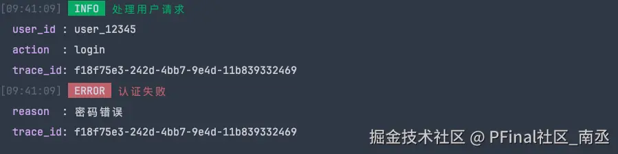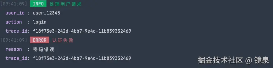 package mainimport ( "context" "github.com/golang-cz/devslog" "github.com/google/uuid" "log/slog" "os")// 创建带追踪 ID 的上下文日志func LoggerWithTraceID(ctx context.Context, logger *slog.Logger) *slog.Logger { traceID := uuid.New().String() return logger.With( slog.String("trace_id", traceID), )}func main() { handler := devslog.NewHandler(os.Stdout, &devslog.Options{}) logger := slog.New(handler) ctx := context.Background() contextLogger := LoggerWithTraceID(ctx, logger) contextLogger.Info("处理用户请求", slog.String("user_id", "user_12345"), slog.String("action", "login"), ) contextLogger.Error("认证失败", slog.String("reason", "密码错误"), )}