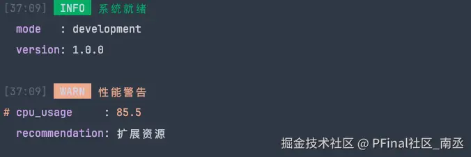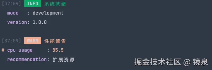 package mainimport ( "log/slog" "github.com/golang-cz/devslog" "os")func main() { // 配置自定义日志选项 handler := devslog.NewHandler(devslog.HandlerOptions{ Level: slog.LevelDebug, Output: os.Stdout, // 输出目标 // 自定义前缀和颜色 Prefix: "MyApp", Colors: devslog.ColorOptions{ Info: devslog.Green, Debug: devslog.Cyan, Warn: devslog.Yellow, Error: devslog.Red, }, }) logger := slog.New(handler) logger.Info("系统就绪", slog.String("version", "1.0.0"), slog.String("mode", "development"), ) logger.Warn("性能警告", slog.Float64("cpu_usage", 85.5), slog.String("recommendation", "扩展资源"), )}