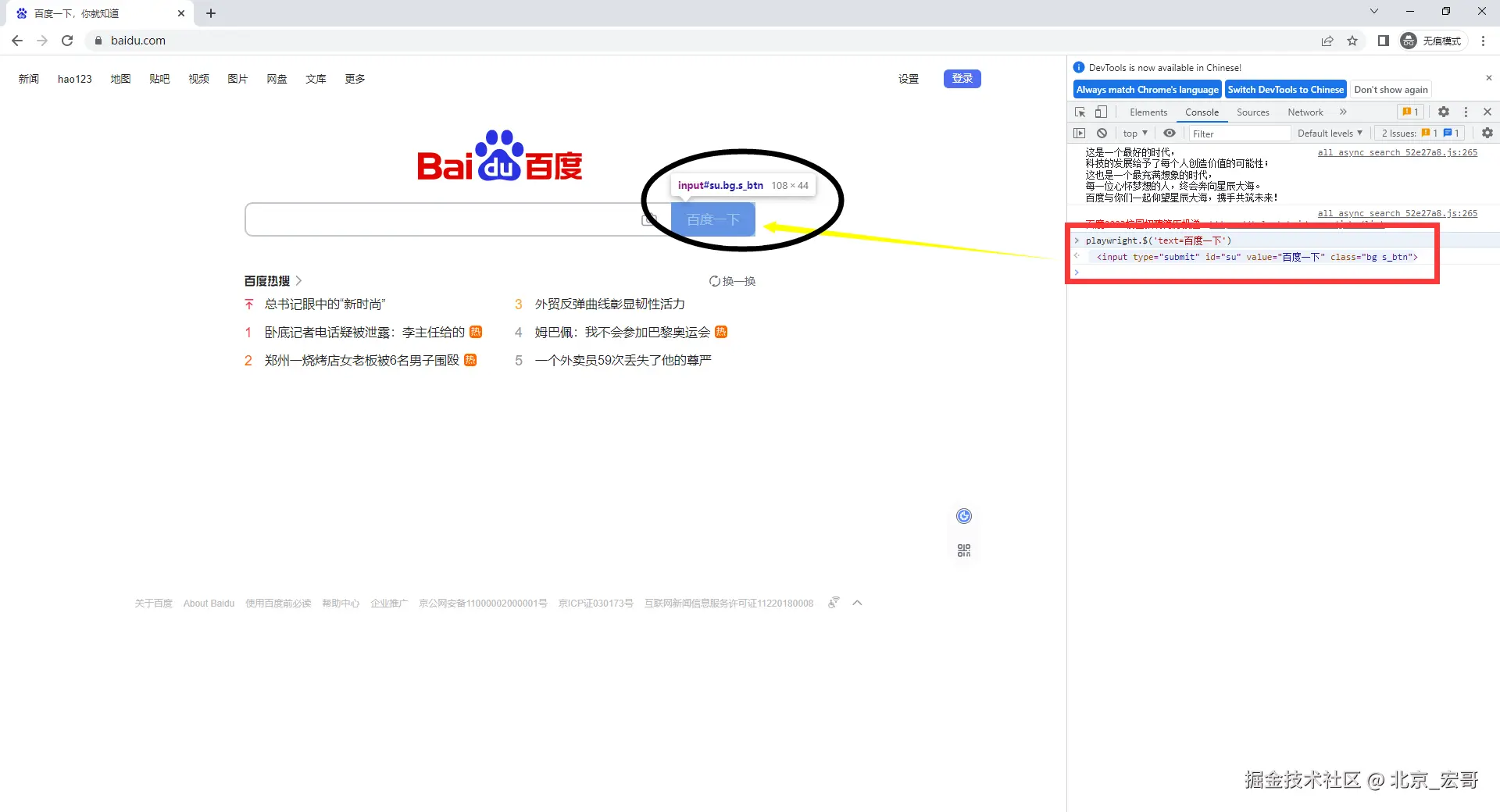 在Playwright Inspector工具上点开启录制按钮,在页面上点点点,就可以生成对应的元素和操作。宏哥就按上边的代码访问完百度首页,然后开启录制按钮在输入框输入“北京-宏哥”,最后点击“百度一下”按钮。在Playwright Inspector工具处生成你点点点的代码。如下图所示: