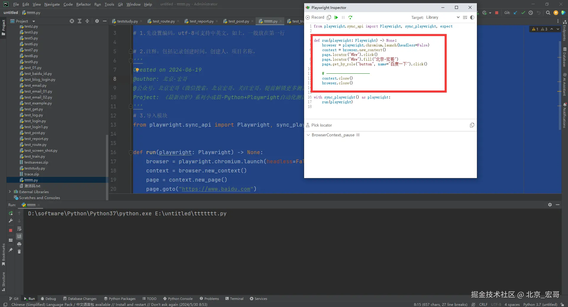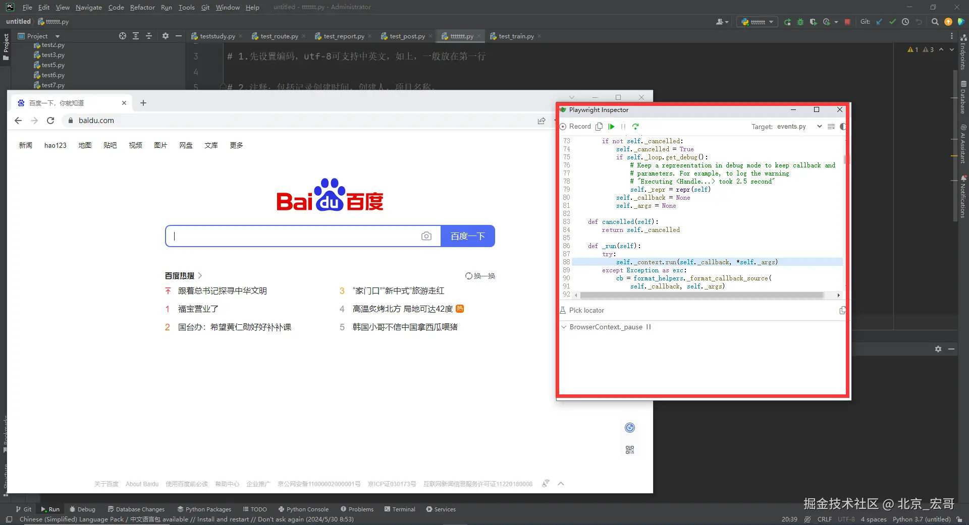 我们在代码中加入page.pause(),Playwright进入调试模式。细心的小伙伴或者童鞋们,相比在之前的文章中,就会发现宏哥有时候会在代码中加入page.pause()。