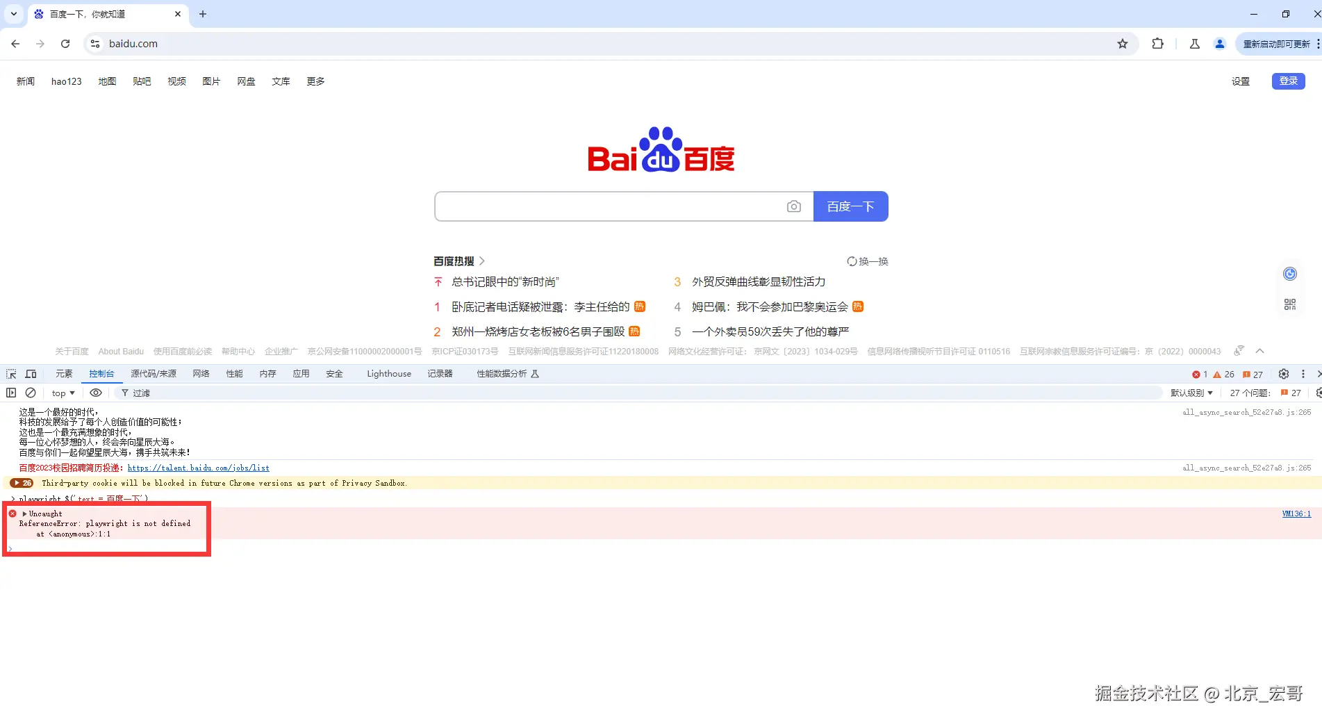 3.敲黑板!如果想用这种方式定位调试,首先要进入playwright的调试模式(具体方法可以查看官方文档:playwright.nodejs.cn/docs/debug#…),才可以用浏览器的控制台定位调试,否则控制台就会报错,如下图所示: