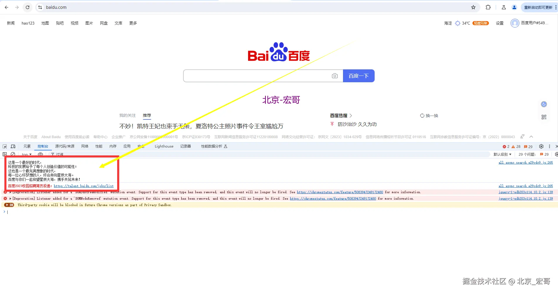 1.当我们在浏览器访问百度页面,然后通过键盘的f12 打开开发者工具或者浏览器右上角打开开发者工具,切换到控制台,会看到console 输出的内容,如下图所示: