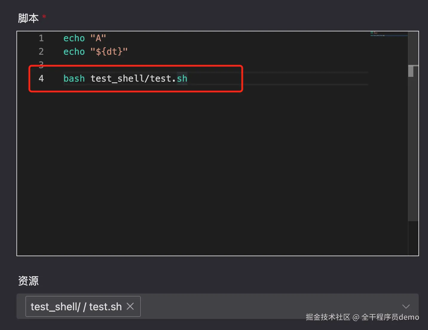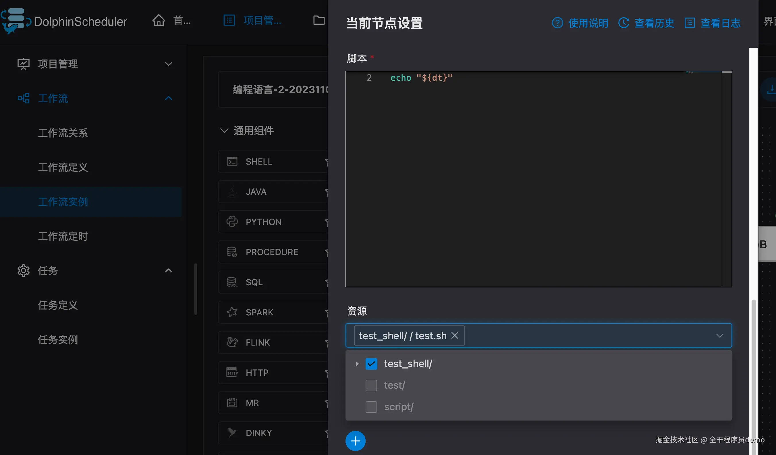该样例主要通过一个简单的 shell 脚本,来演示如何在工作流定义中使用资源中心的文件。像 MR、Spark 等任务需要用到 jar 包,也是同理。