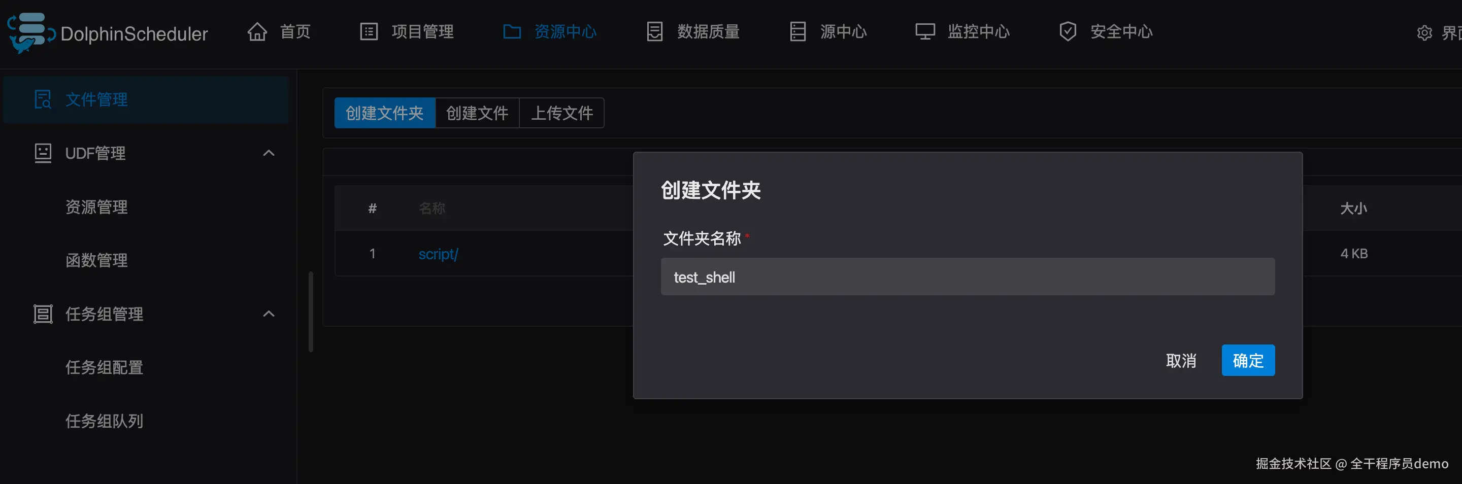 资源中心通常用于上传文件、UDF 函数和任务组管理。