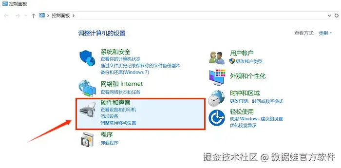 步骤1: 打开 “控制面板” ,找到 “硬件和声音” ,再进入 “电源选项” 。