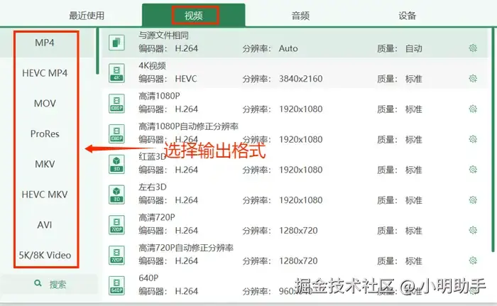 第三步: 可以点击左下角输出格式旁边的浅绿色框进行统一格式设置,也可以点击上传视频对应的右侧图标对单独一个视频进行格式设置。进入格式设置界面后,点击界面上方的【视频】按钮,在左侧的视频选择栏内选择自己需要的输出格式。