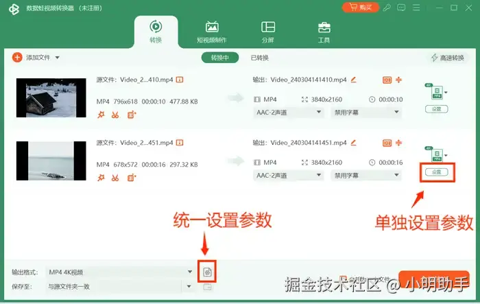 第四步: 我们还可以点击界面下方的小齿轮状图标进行统一的参数设置,也可以点击上传视频对应的右侧【设置】按钮进行单个视频的参数设置。