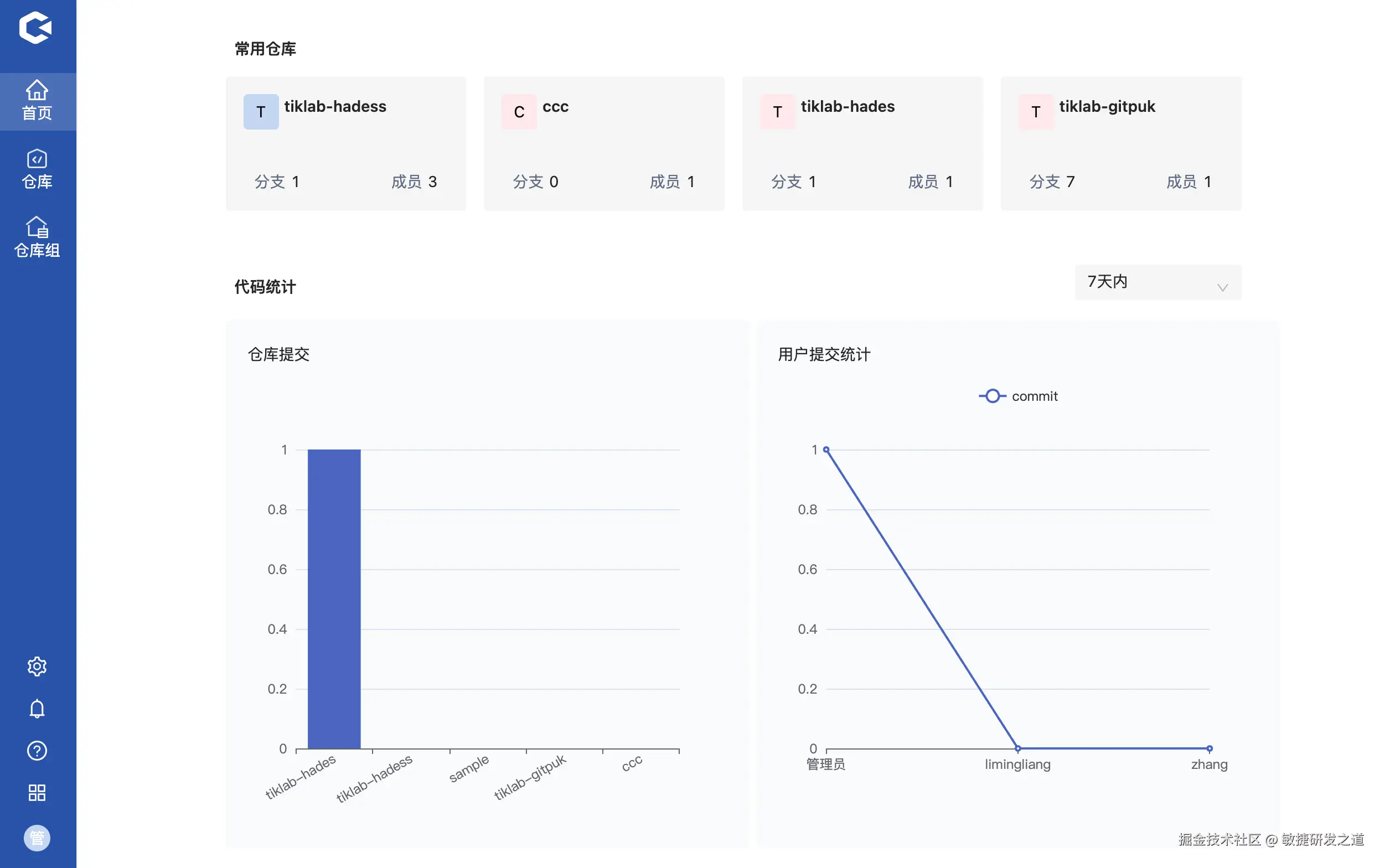 概览分为系统级别概览、仓库级别的概览。系统概览展示最近访问的仓库以及所有仓库提交、成员的提交、以及待办信息;仓库级别概览展示该仓库的最近的提交、提交数量、该仓库的待办事项